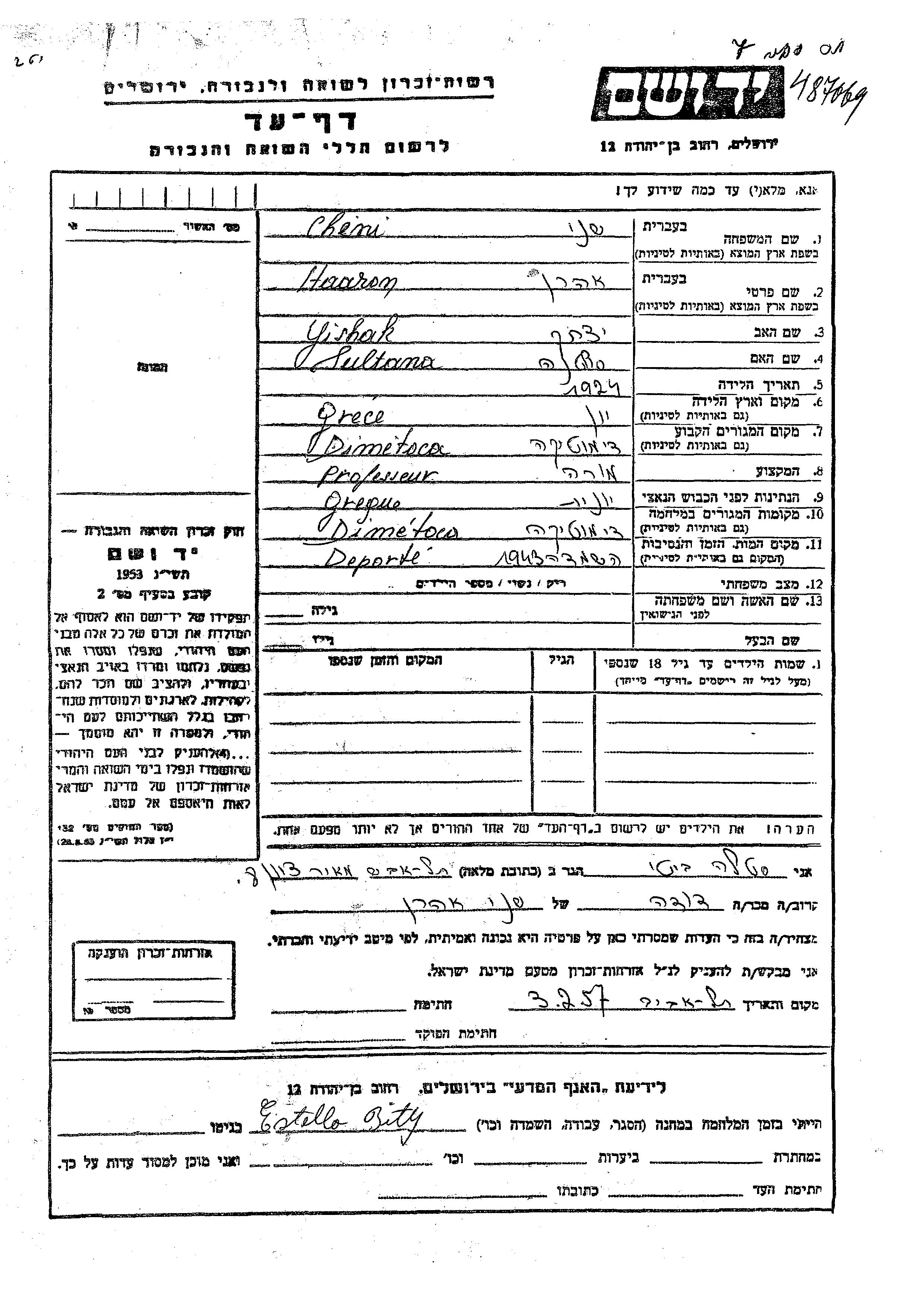 Haaron Cheni was born in Greece, 1924 to Yishak and Sultana. He was a teacher. Prior to WWII he lived in Dimotika, Greece. During the war he was in Dimotika, Greece.
