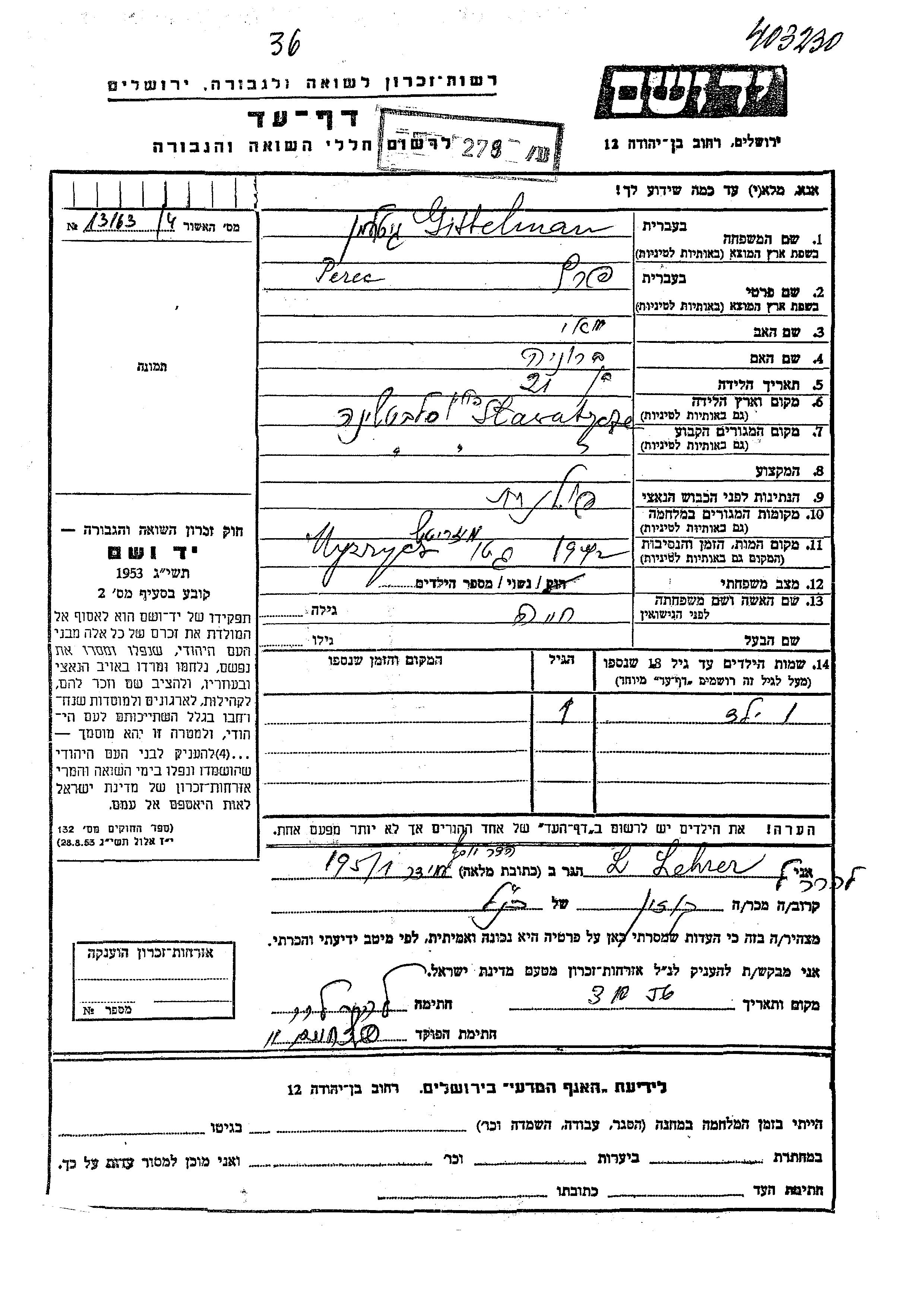 Gittelman Perec Slawatycze, Poland Page of Testimony