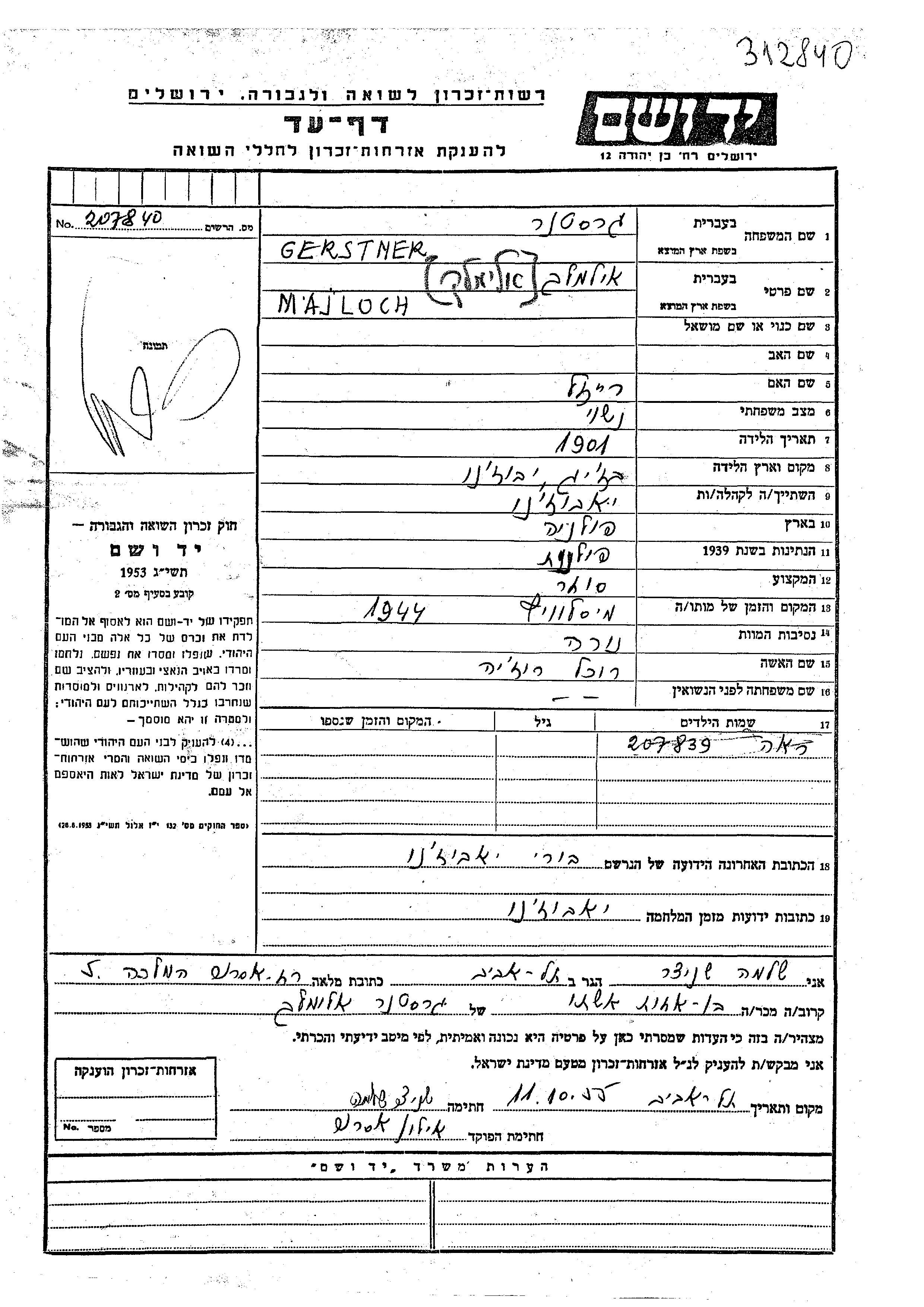 Majloch Ilemelekh Gerstner was born in Brzeg, Poland, 1901 to Reizl. He was a merchant and married to Rukhel Rozia. Prior to WWII he lived in Jaworzno, Poland. During the war he was in Jaworzno, Poland. Majloch Ilemelekh was murdered in the Shoah. Place of death: Mislowiec, Poland, 1944.