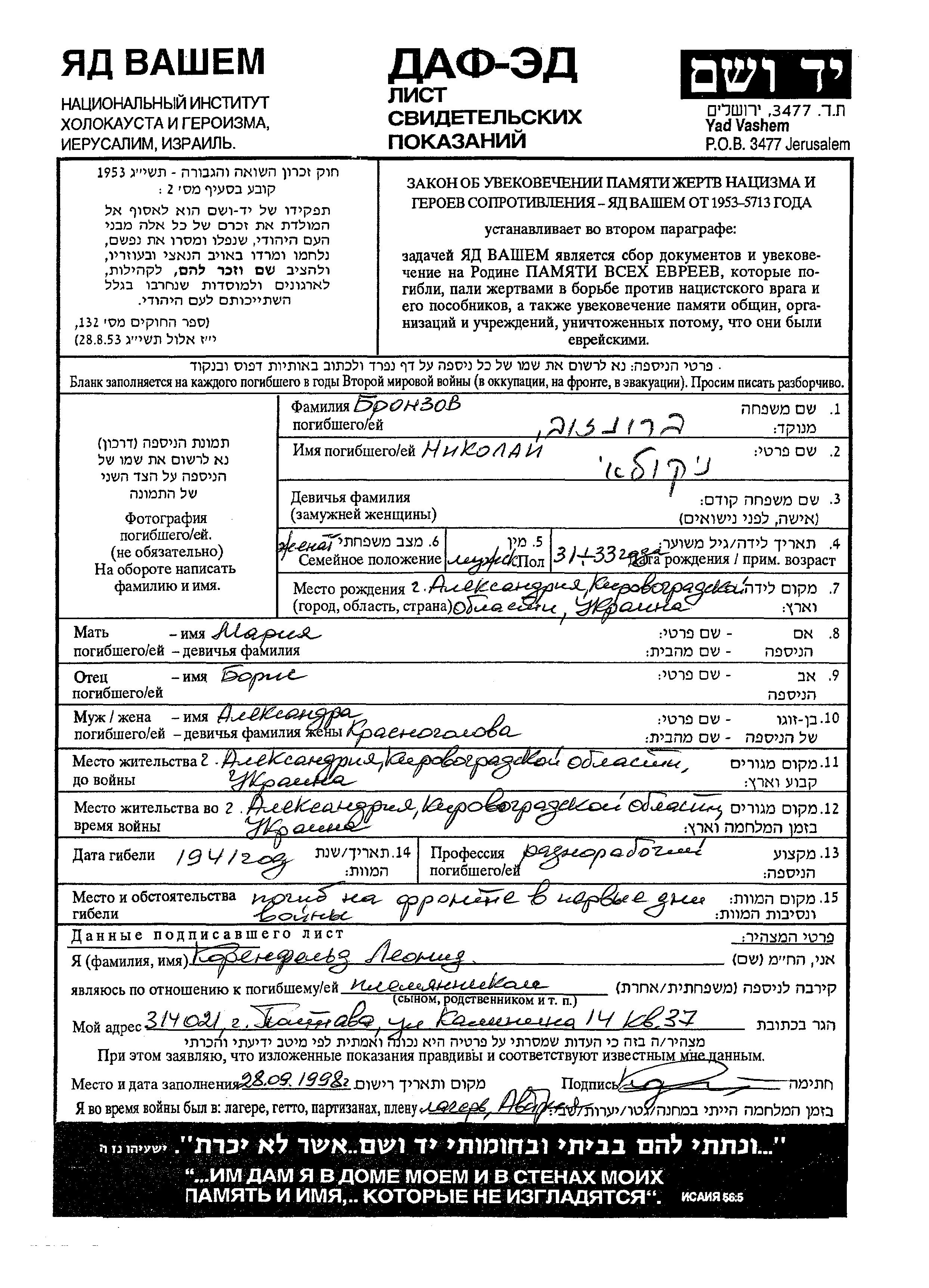 Bronzov Nikolai Aleksandriya, Ukraine (USSR) Page of Testimony