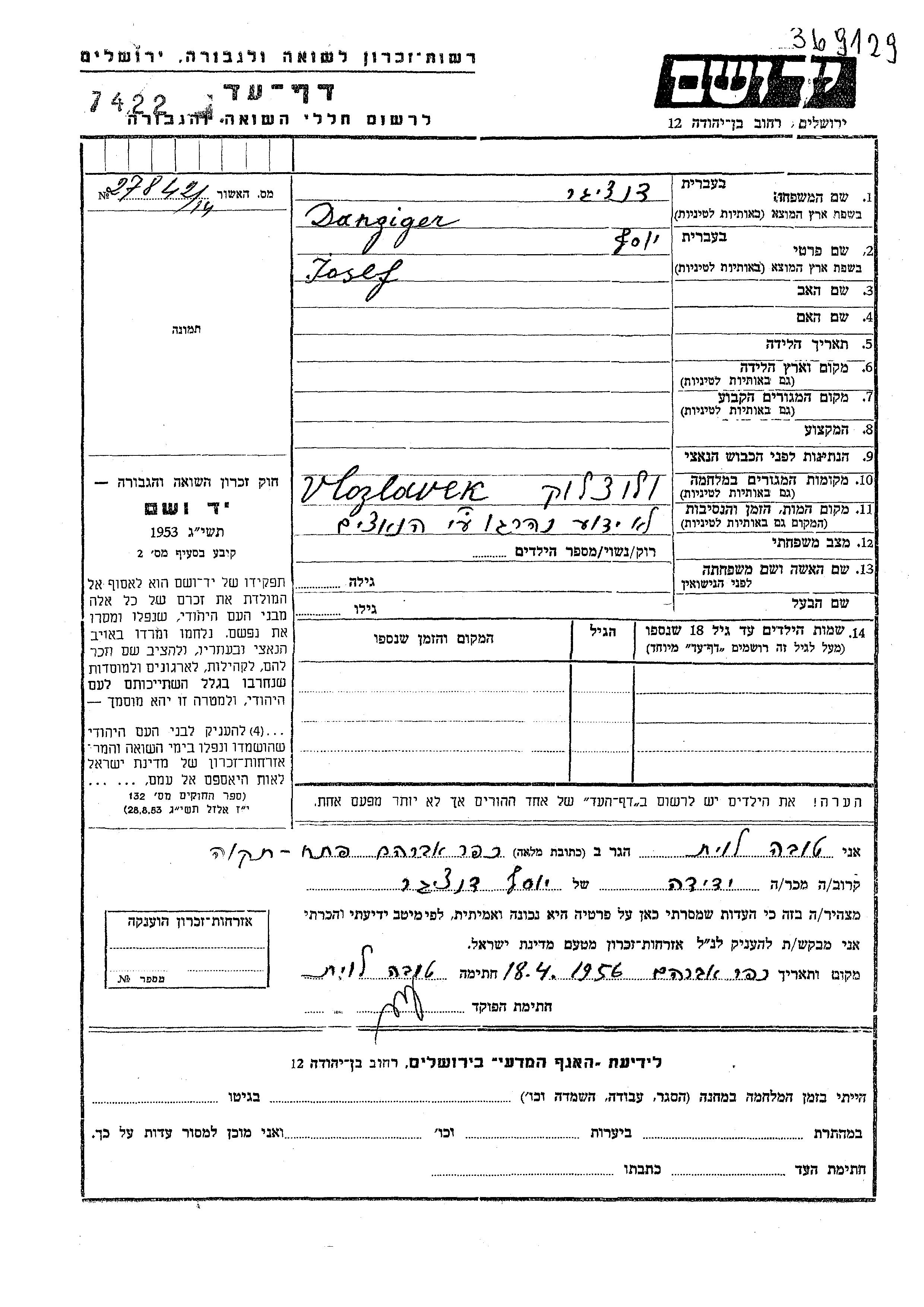 Danziger Josef unstated place, Page of Testimony