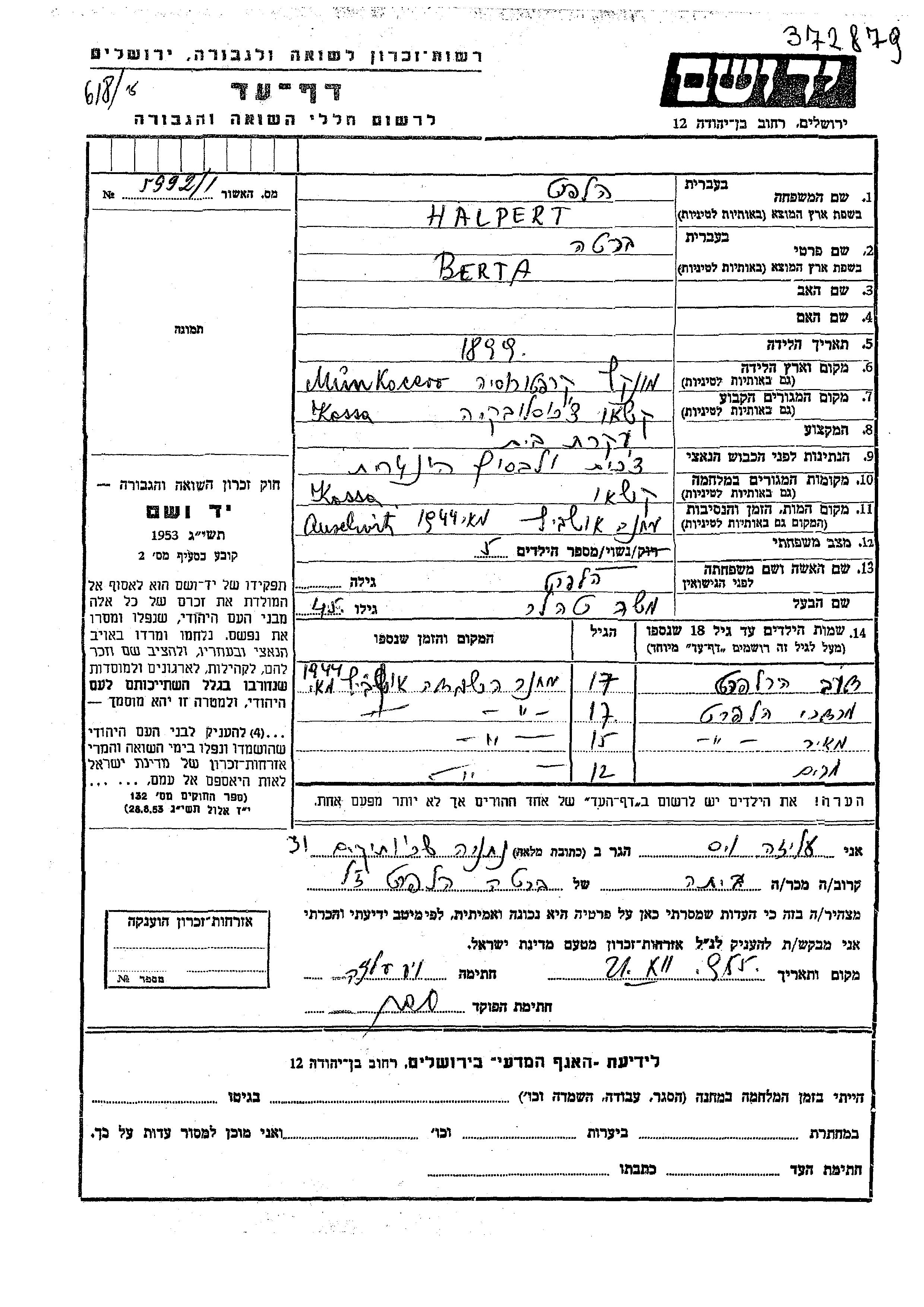 Taler Halpert Berta 1899 Kassa, Czechoslovakia Page of Testimony