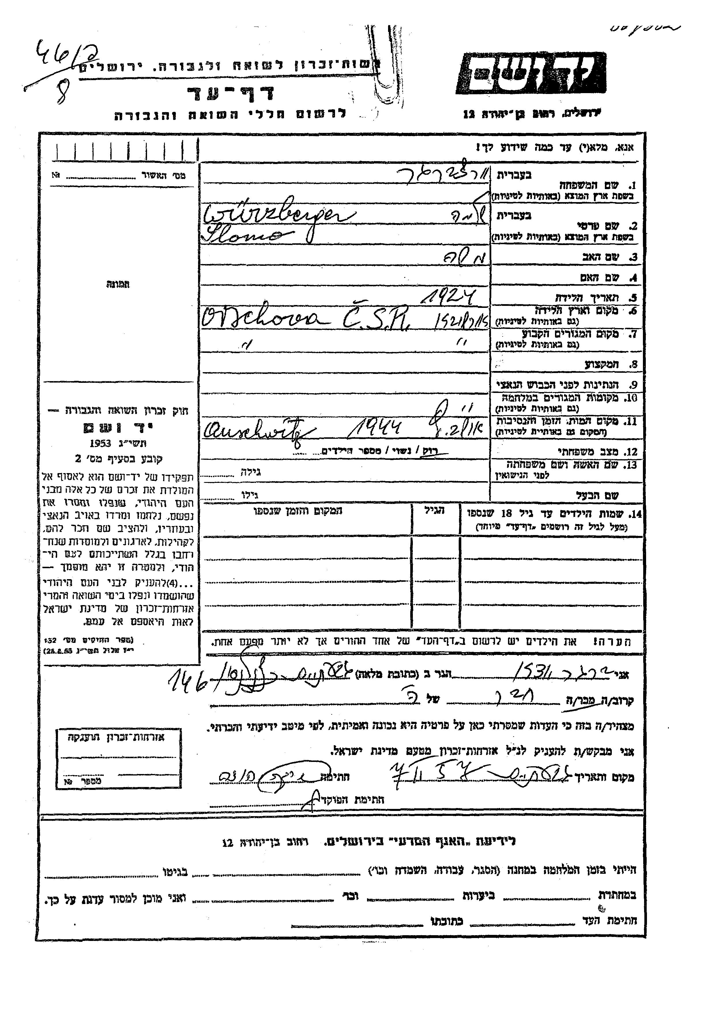 Slomo Wuerzberger was born in Orschova, Czechoslovakia, 1924 to Moshe. He was single.