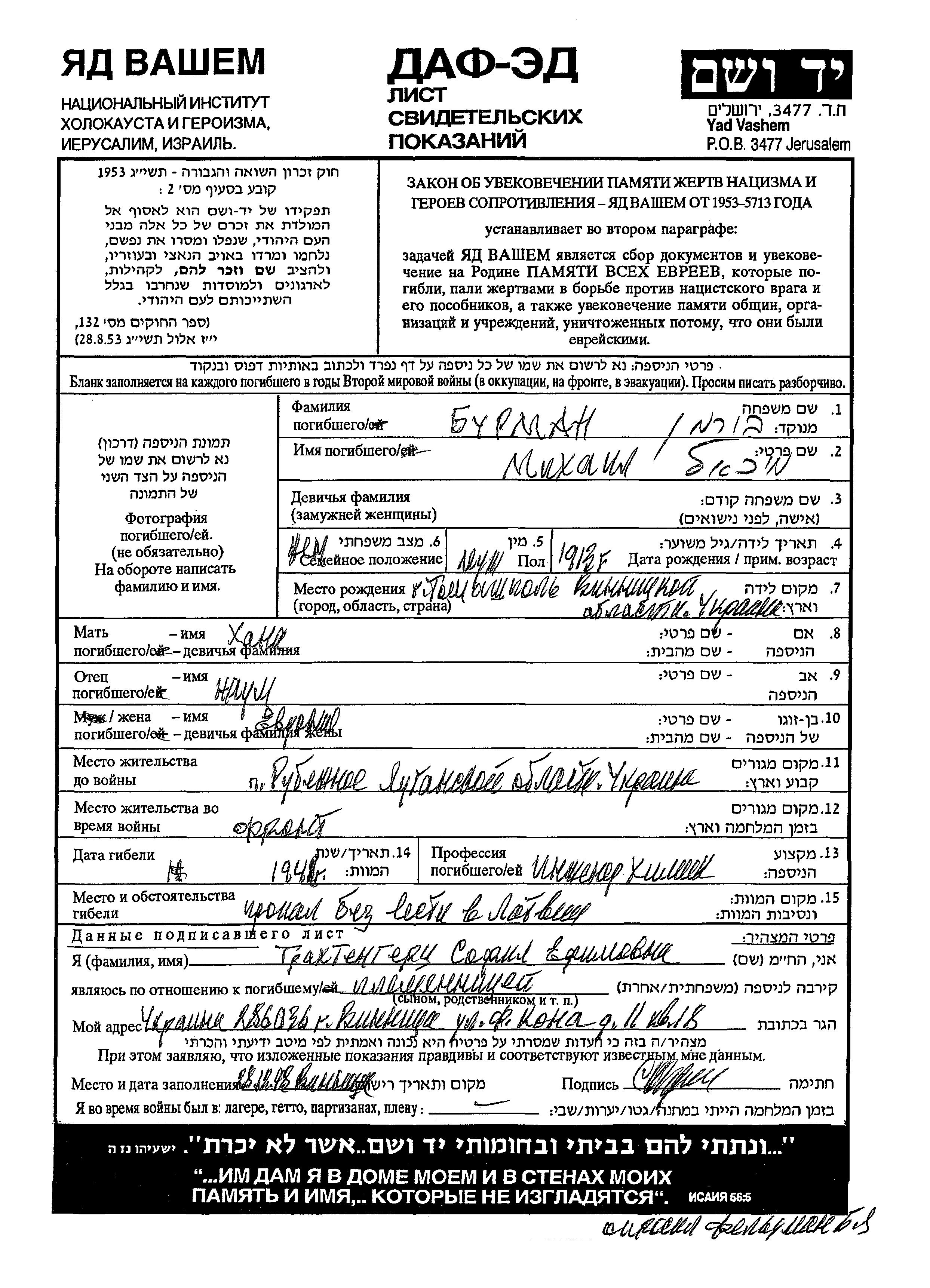 Mikhail Burman was born in Tomashpol, Ukraine (USSR), 1913 to Naum and Khana. He was an inzhener khimik and married to Evgeniya. Prior to WWII he lived in Rubezhnoye, Ukraine (USSR). During the war he was in the Soviet armed forces. Mikhail was murdered in the Shoah. Place of death: Latvia, 1941.