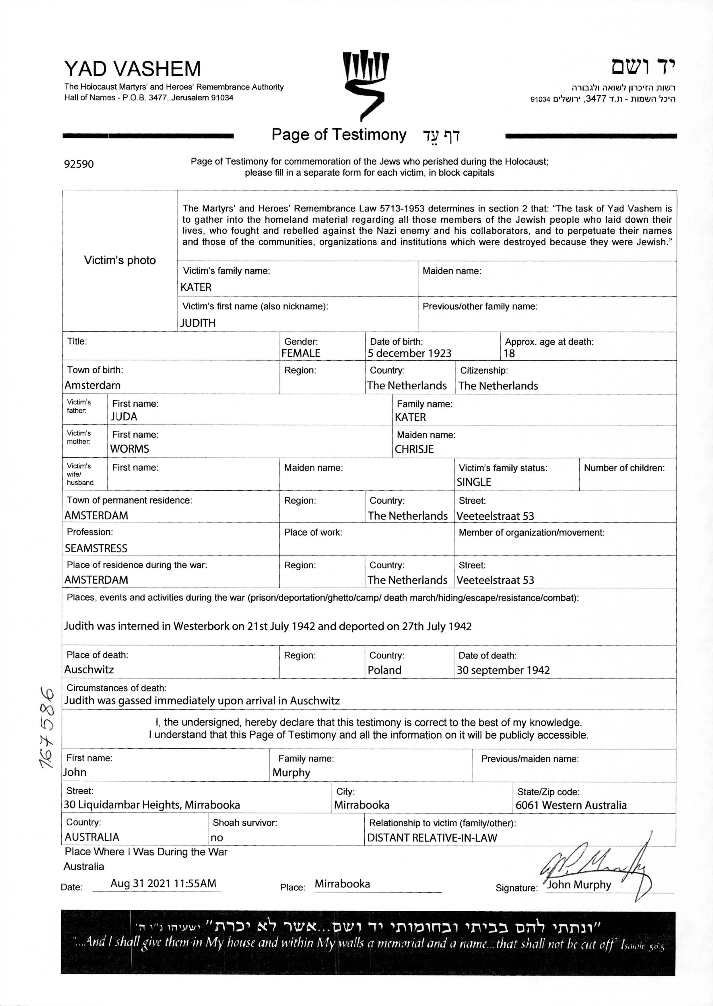 Kater Judith 1923 Amsterdam, The Netherlands Page of Testimony (digital signed)
