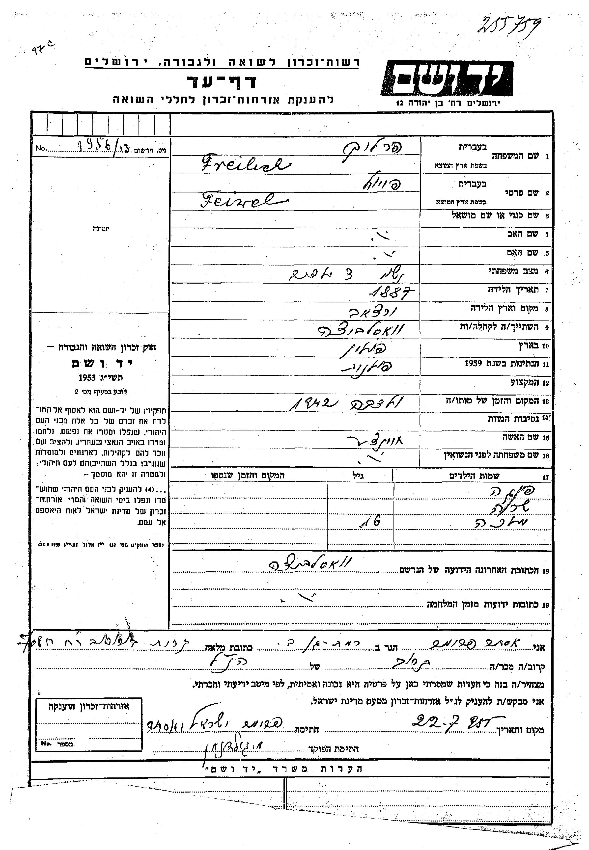 Feiwel Freilich was born in Jarczow, Poland, 1887. He was married to Khaintze. Prior to WWII he lived in Wojslawice, Poland. During the war he was in Wlodawa, Poland.