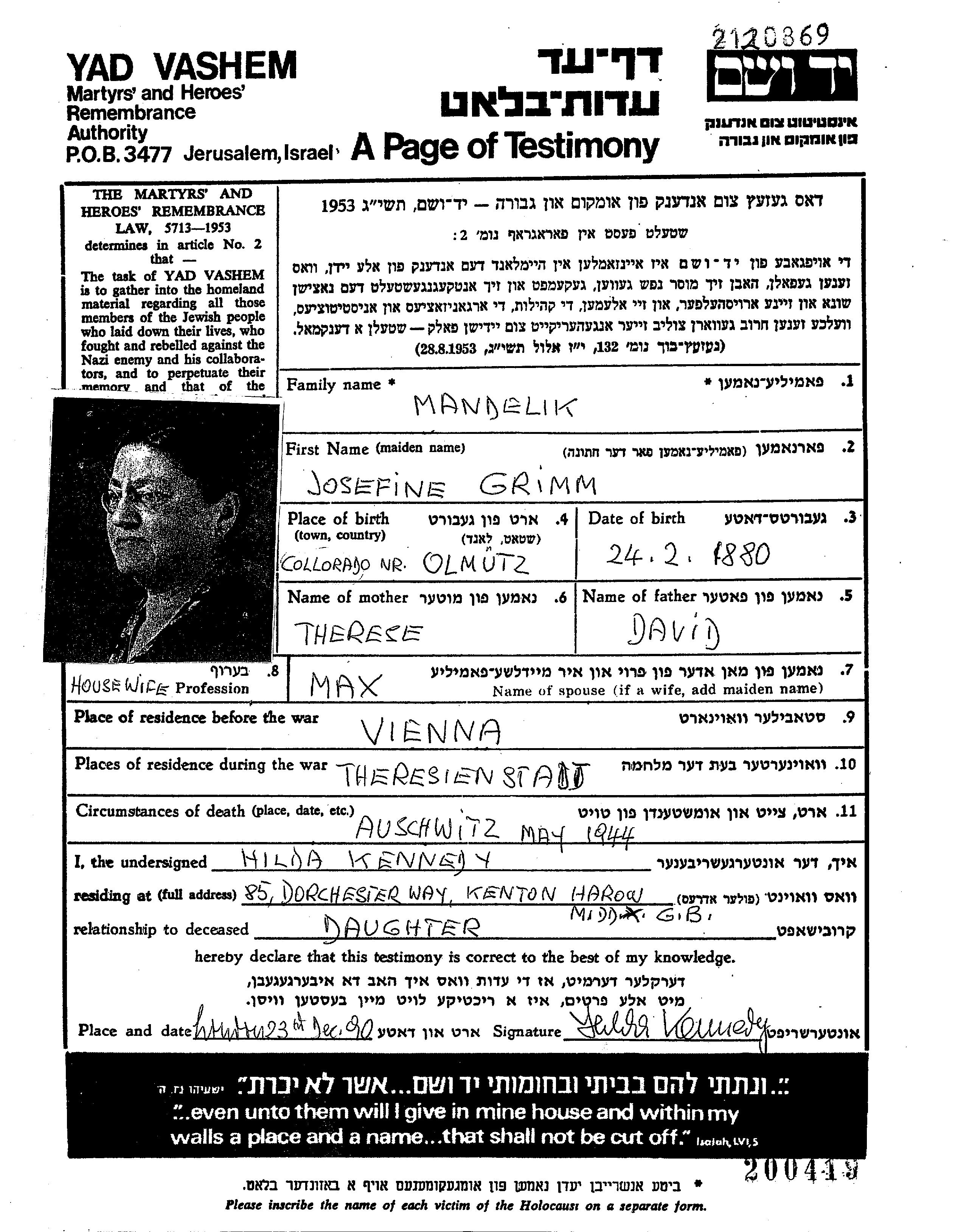 Mandelik Josefine 1880 Wien, Austria Page of Testimony