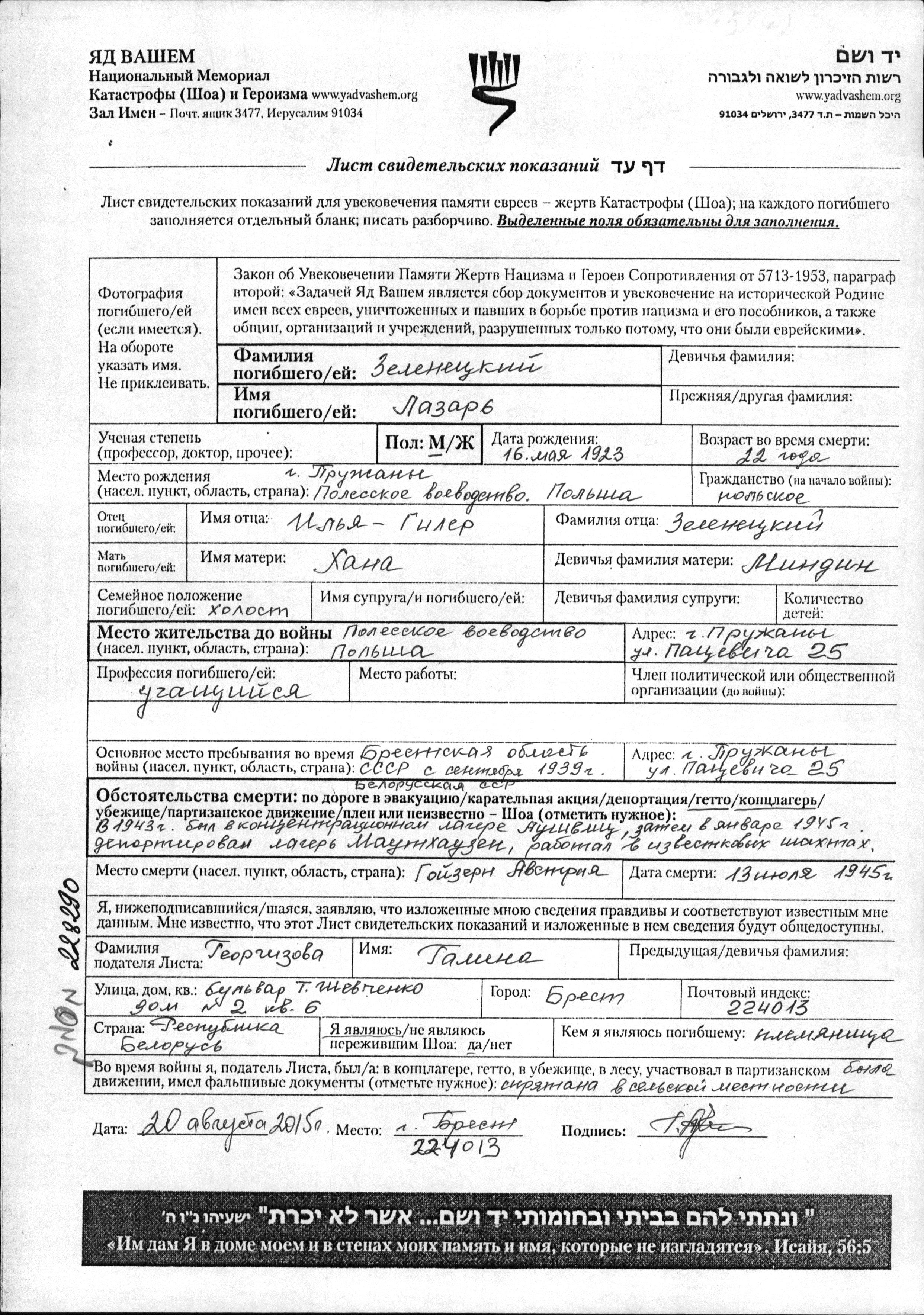 Zelenetzkiy Lazar 1923 Pruzhany, Poland Page of Testimony