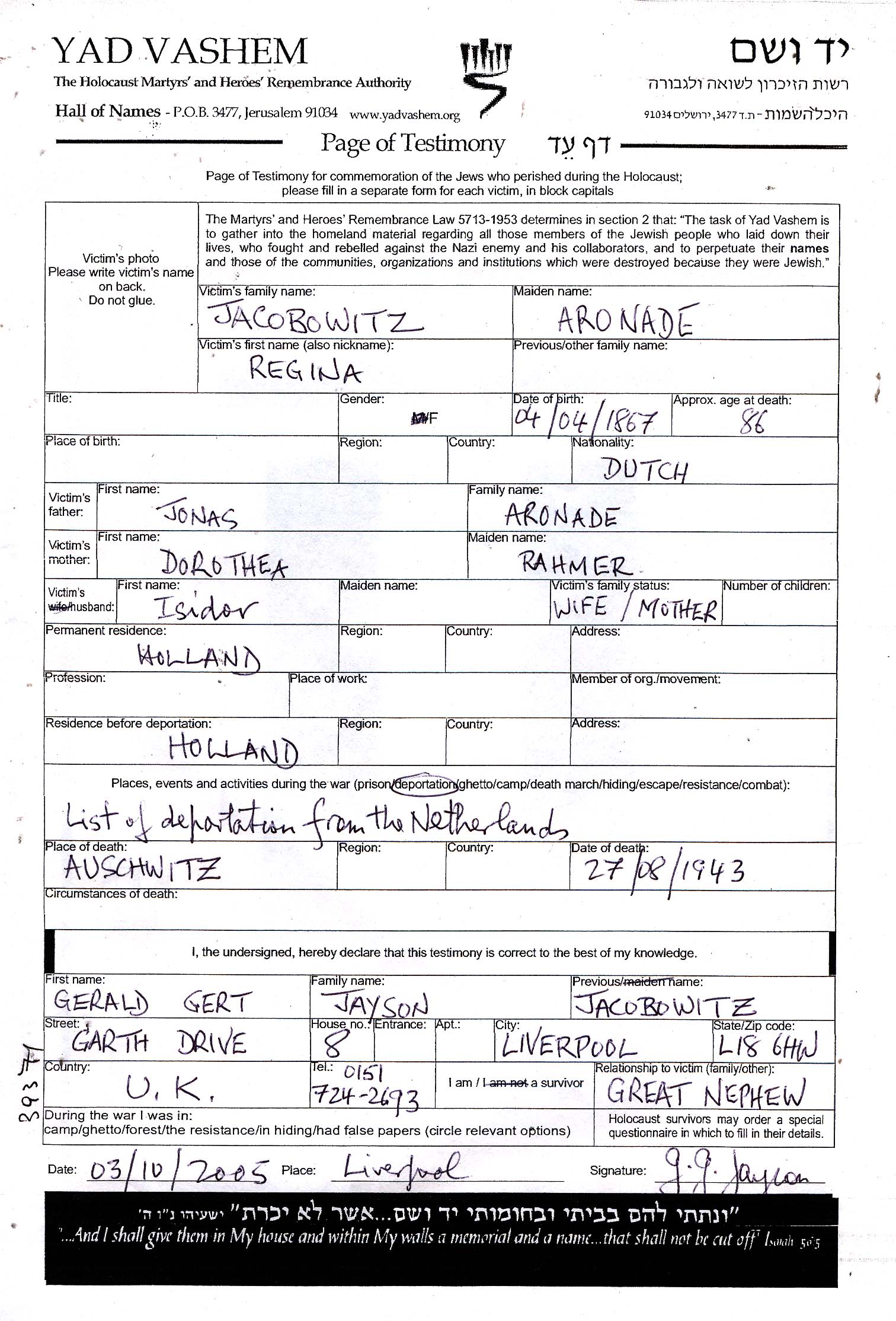 | Jacobowitz | Regina | 1867 | Amsterdam, The Netherlands | Page of Testimony |