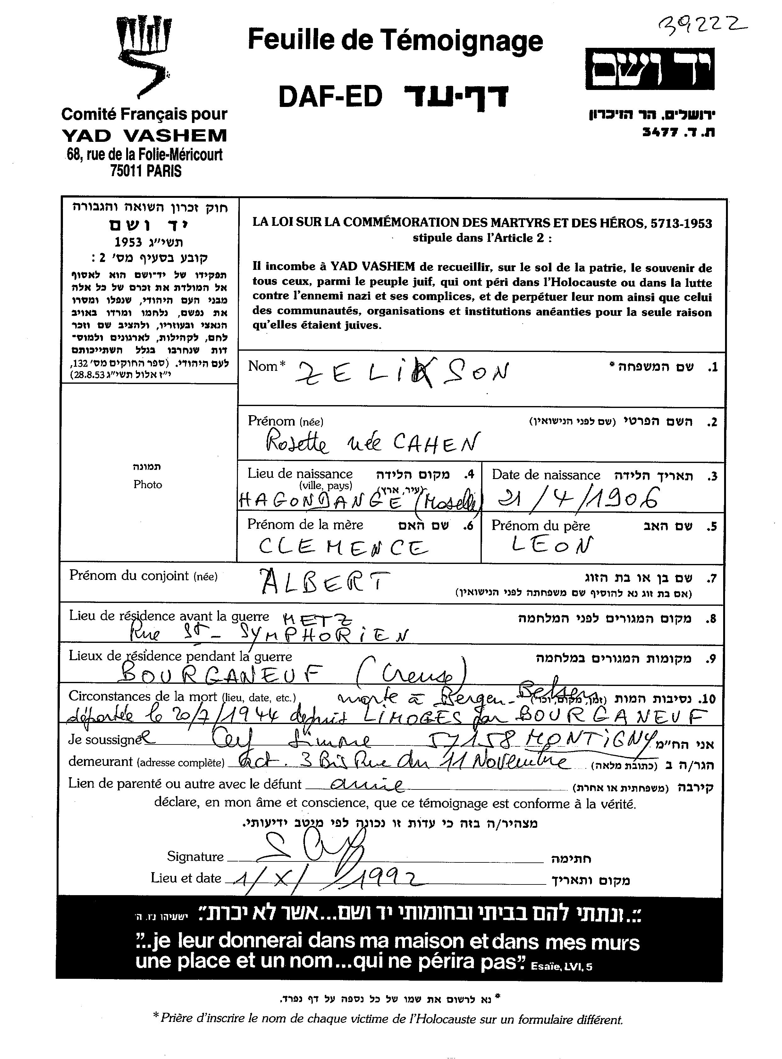 Rosette Zelikzon nee Cahen was born in Hagondange, France, 1906. Prior to WWII she lived in Metz, France.