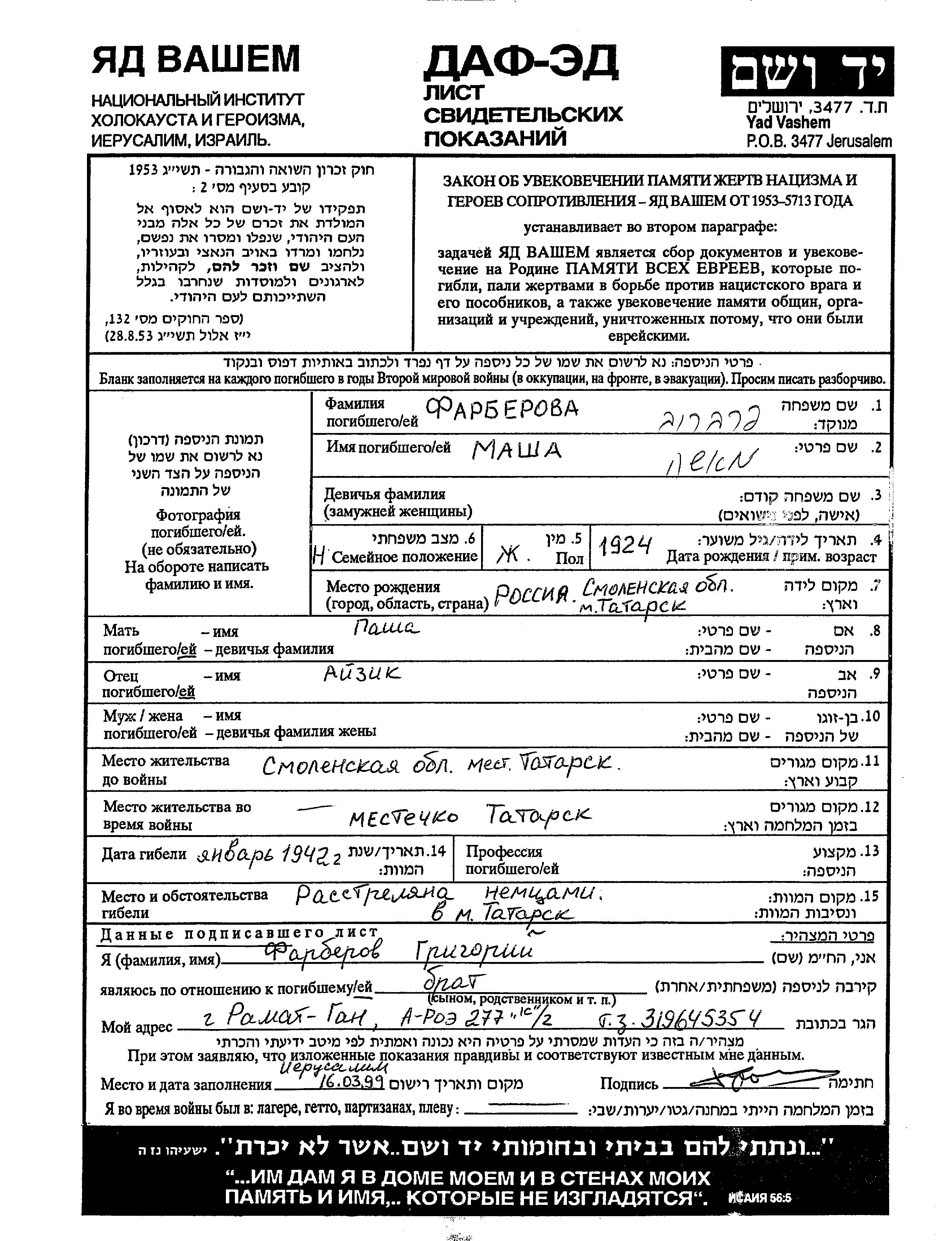Masha Farberov was born in Tatarsk, Russia (USSR), 1924 to Aizik and Pasha. She was single. Prior to WWII she lived in Tatarsk, Russia (USSR). During the war she was in Tatarsk, Russia (USSR). Masha was murdered in the Shoah. Place of death: Tatarsk, Russia (USSR), 1942.