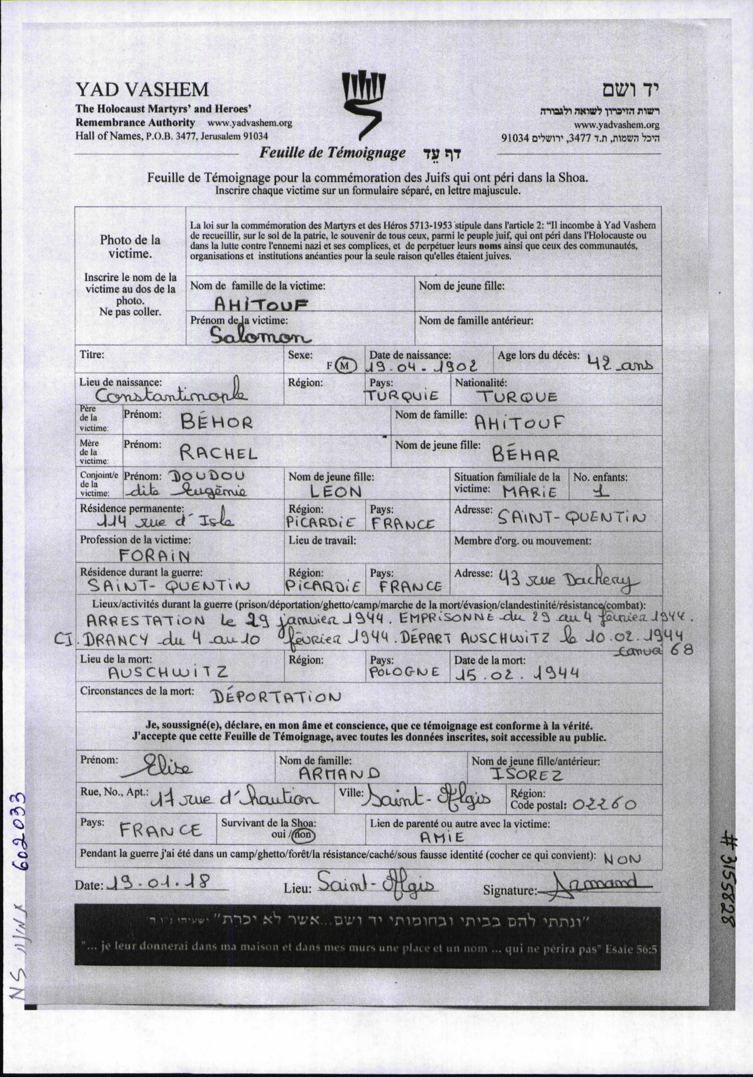 | Ahitouf | Salomon | 1902 | Saint Quentin, France | Page of Testimony |