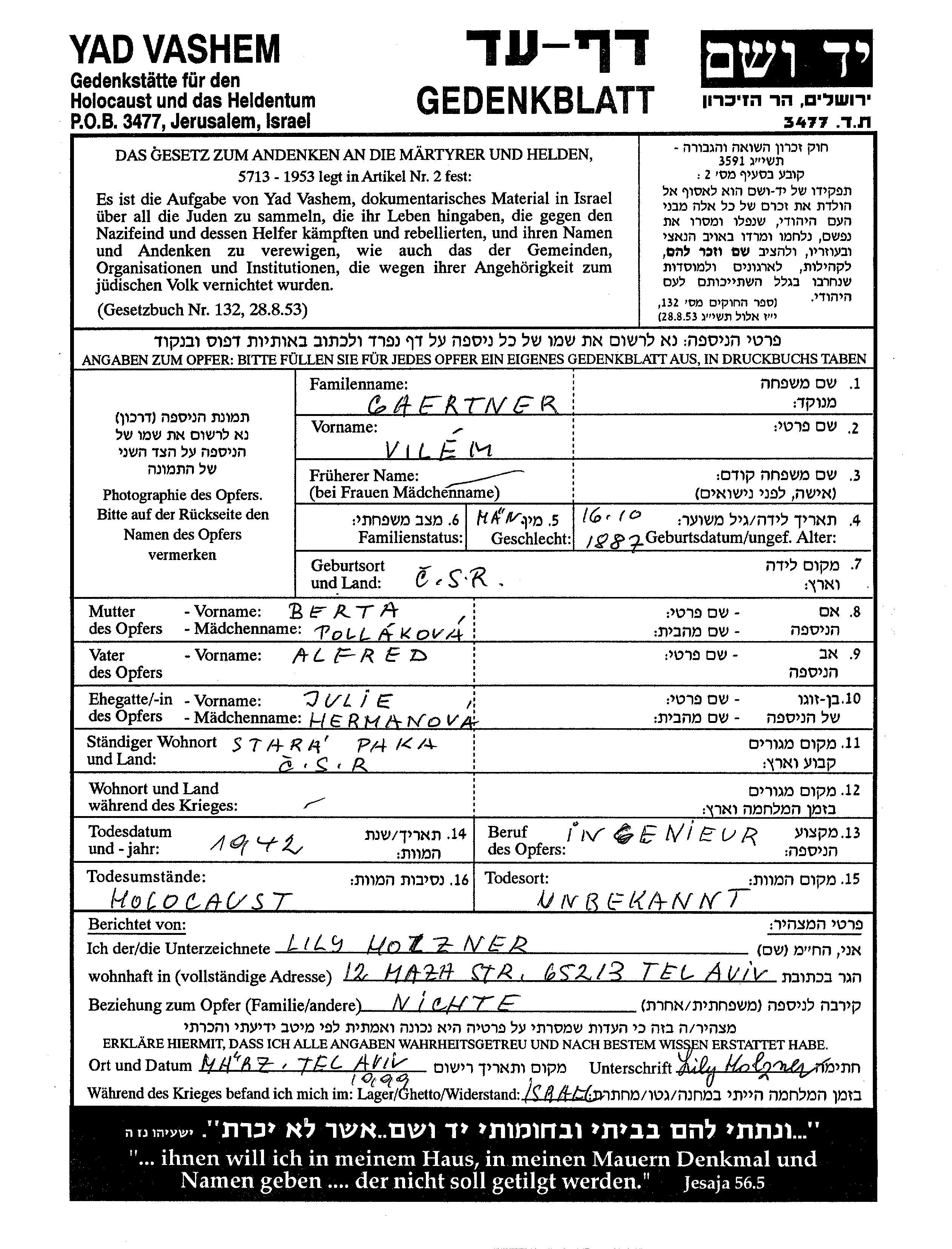 Vilem Gaertner was born in Czechoslovakia, 1887 to Alfred and Berta. He was an engineer and married to Julie nee Hermanova. Prior to WWII he lived in Stara Paka, Czechoslovakia. Vilem was murdered in the Shoah. Place of death: unknown, 1942.
