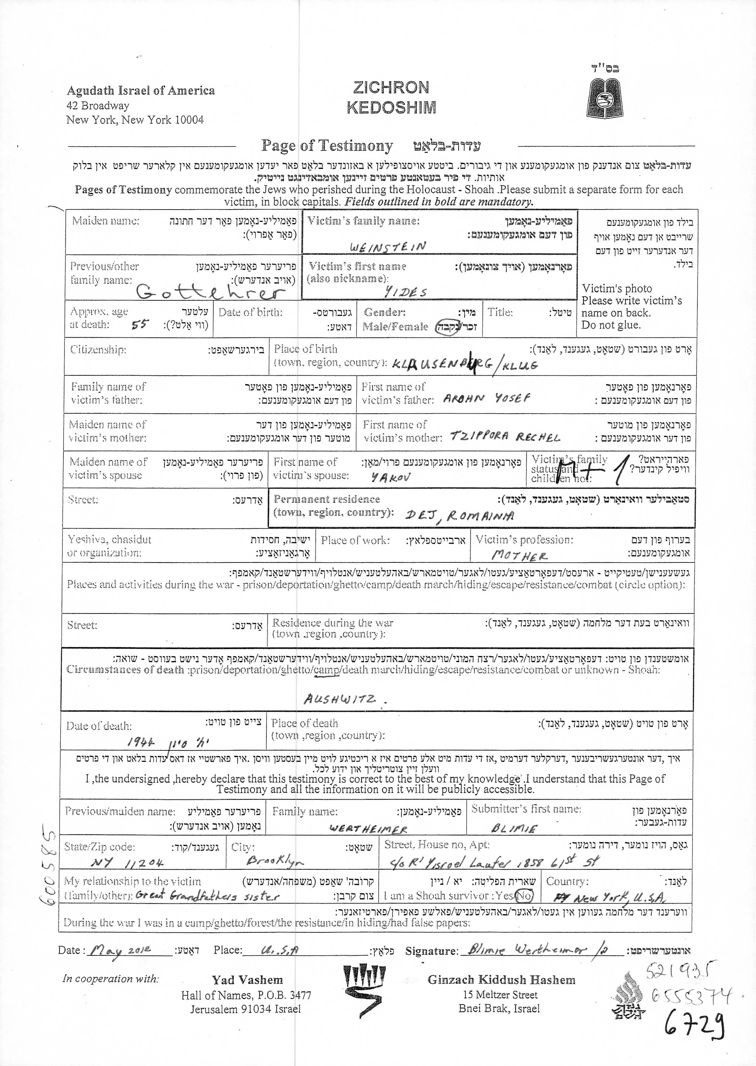 Yides Weinstein nee Gottehrer was born in Klausenburg, Romania to Arohn Yosef and Tzippora Rechel. She was married to Yakov. Prior to WWII she lived in Dej, Romania.