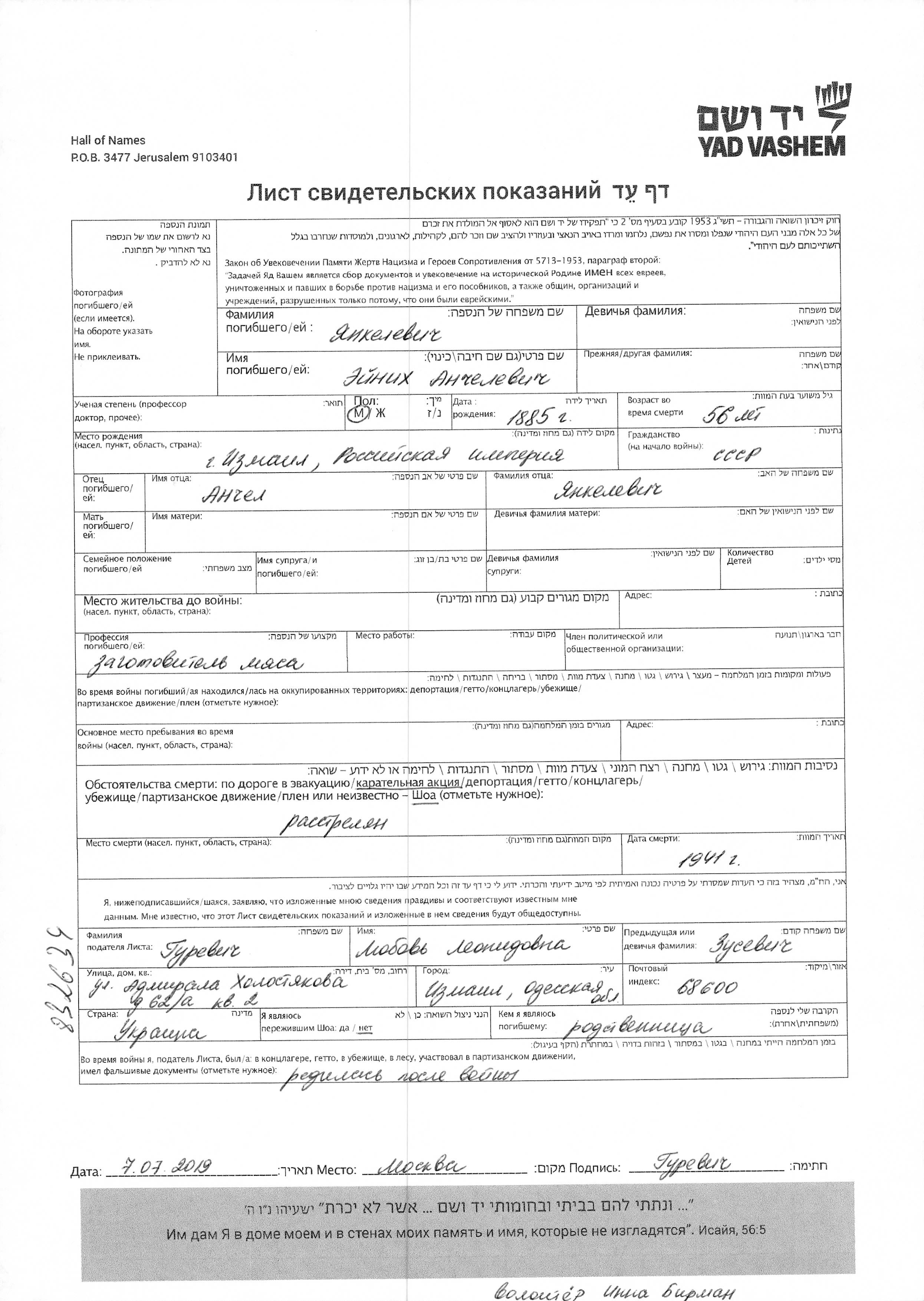 Yankelevich Eynikh 1885 Soviet Union Page of Testimony