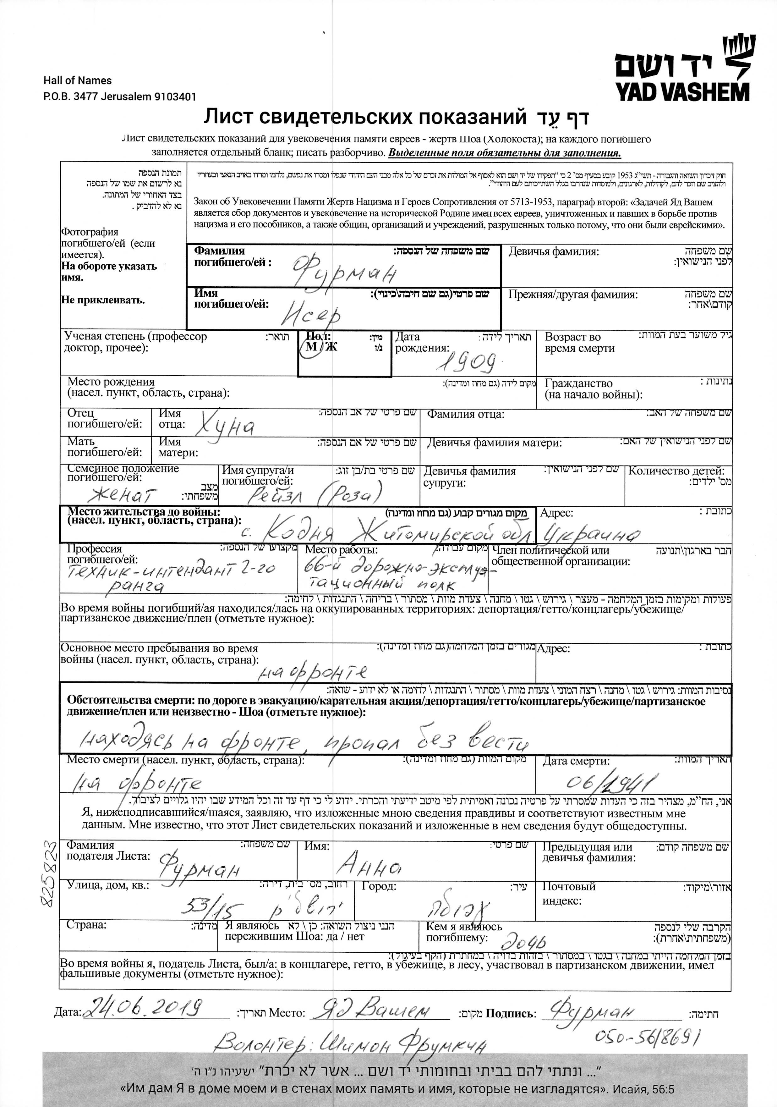 Iser Furman was born, 1909 to Khuna. He was a military man and married to Reyzl. Prior to WWII he lived in Kodnya, Ukraine (USSR). During the war he was in Kodnya, Ukraine (USSR). Iser was murdered in the Shoah. Place of death: Soviet Union, 06/1941.