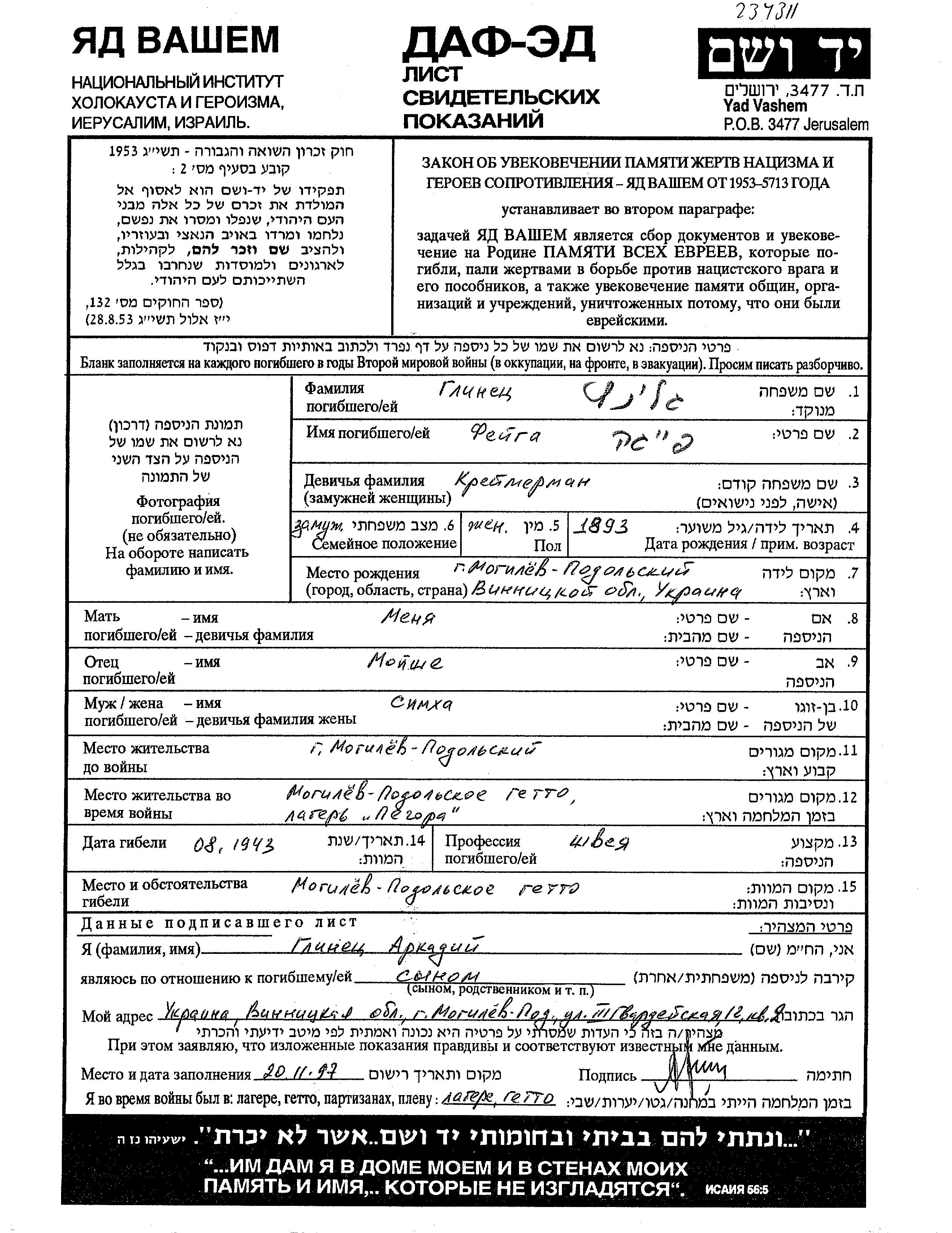 Glinetz Feiga 1893 Mogilev Podolski, Ukraine (USSR) Page of Testimony