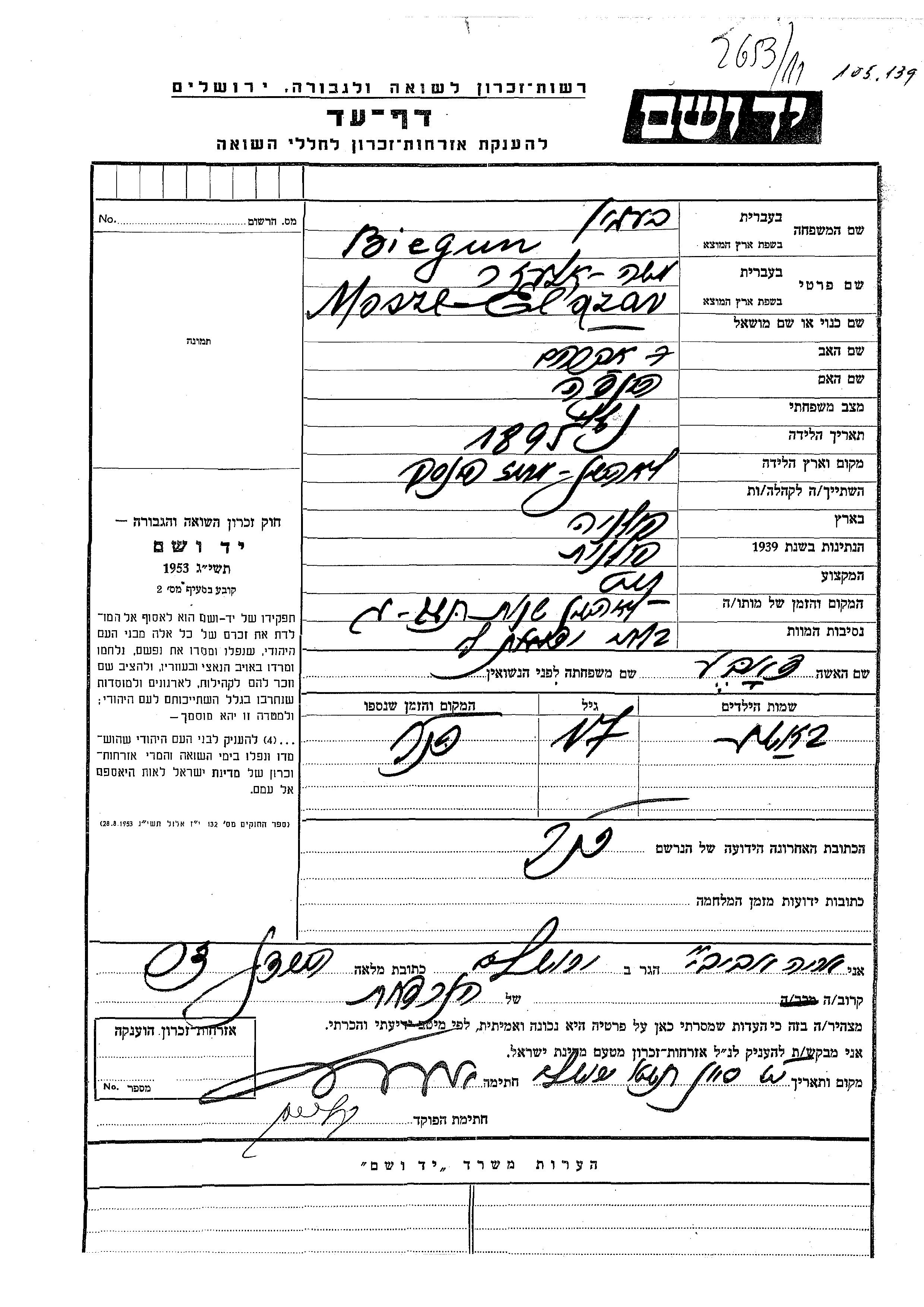Eliezer Moshe Begun was born in Lahiszyn, Poland. He was a tailor. Prior to WWII he lived in Lahiszyn, Poland. Eliezer Moshe was murdered in the Shoah. Place of death: Lahiszyn, Poland.