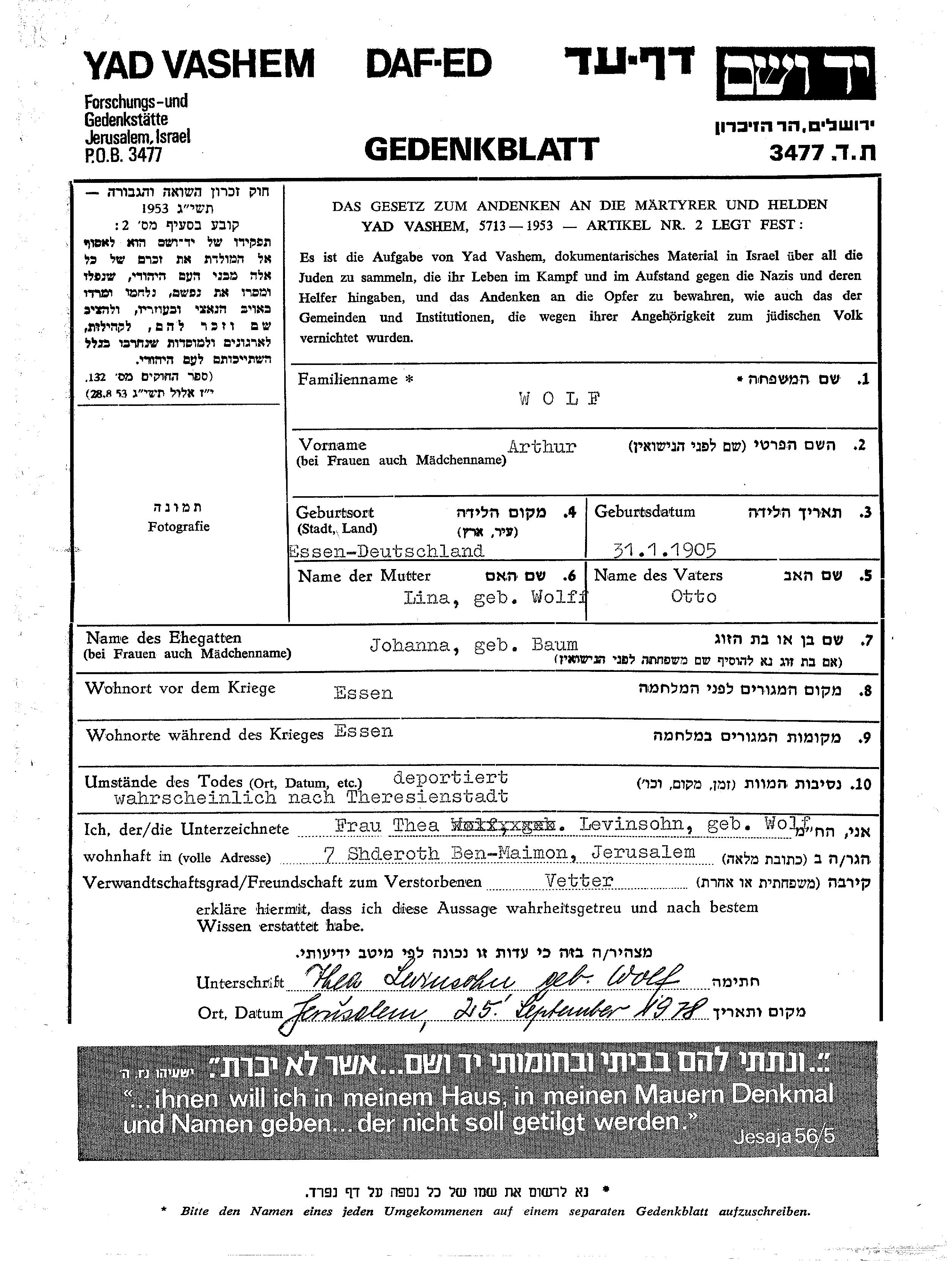 Wolf Arthur 1905 Essen, Germany Page of Testimony