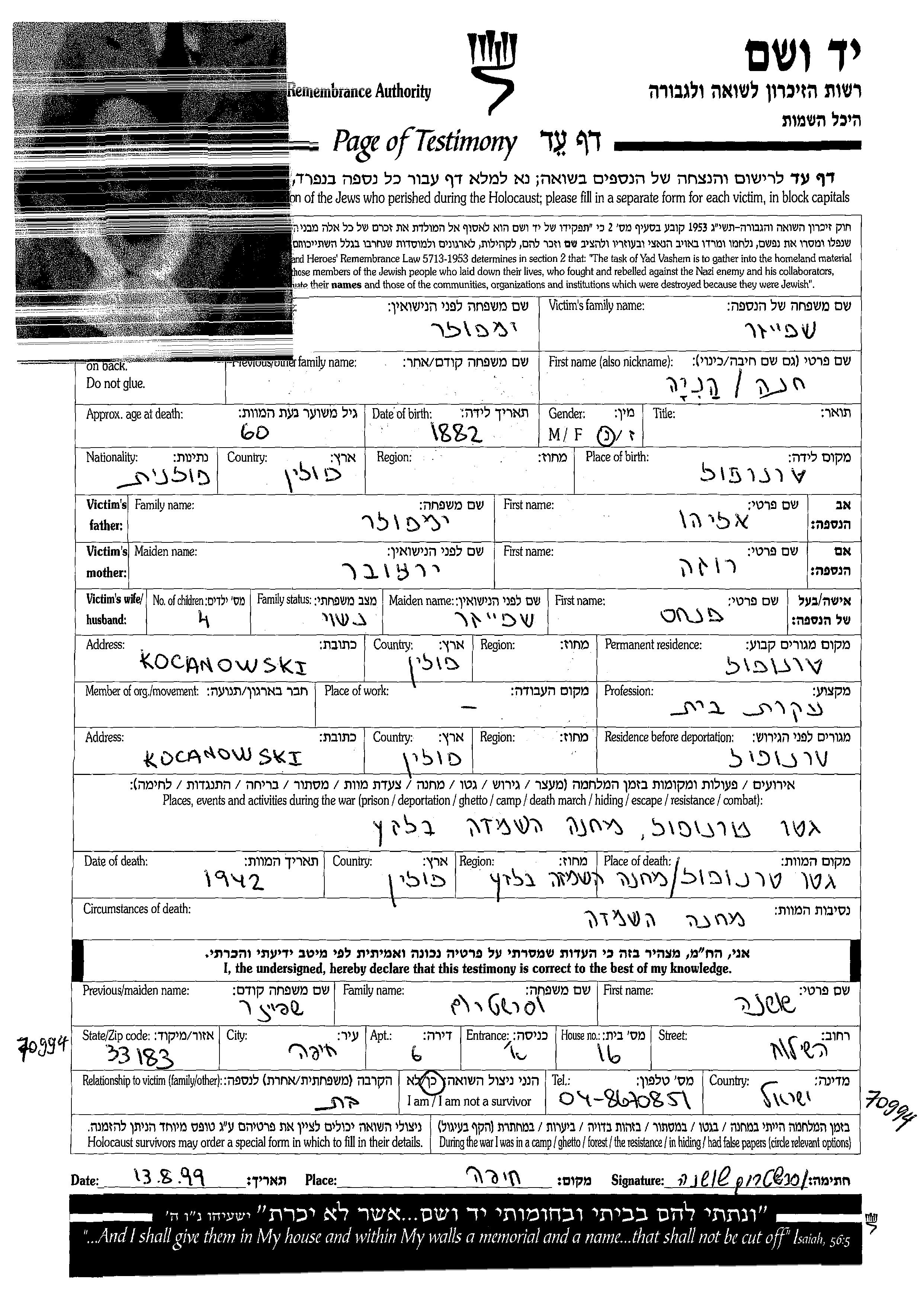 Shpeizer | Khana | 1882 | Tarnopol, Poland | Page of Testimony |