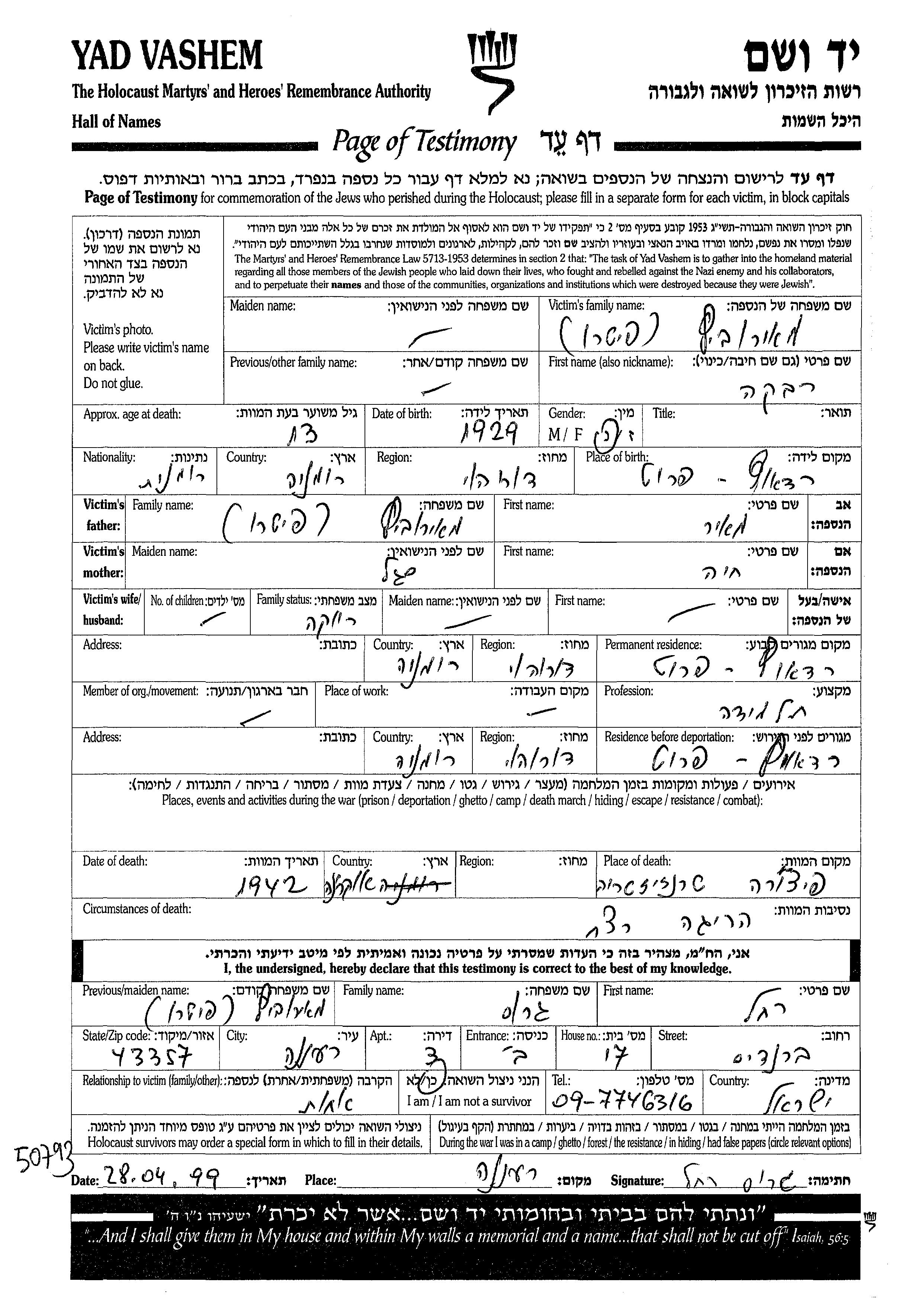 Rivka Meirovici Mashkovitz Pitaru was born in Radauti Prut, Romania, 1929. She was a pupil. Prior to WWII she lived in Radauti, Romania. Rivka was murdered in the Shoah. Place of death: Transnistria, Ukraine (USSR), 1942.