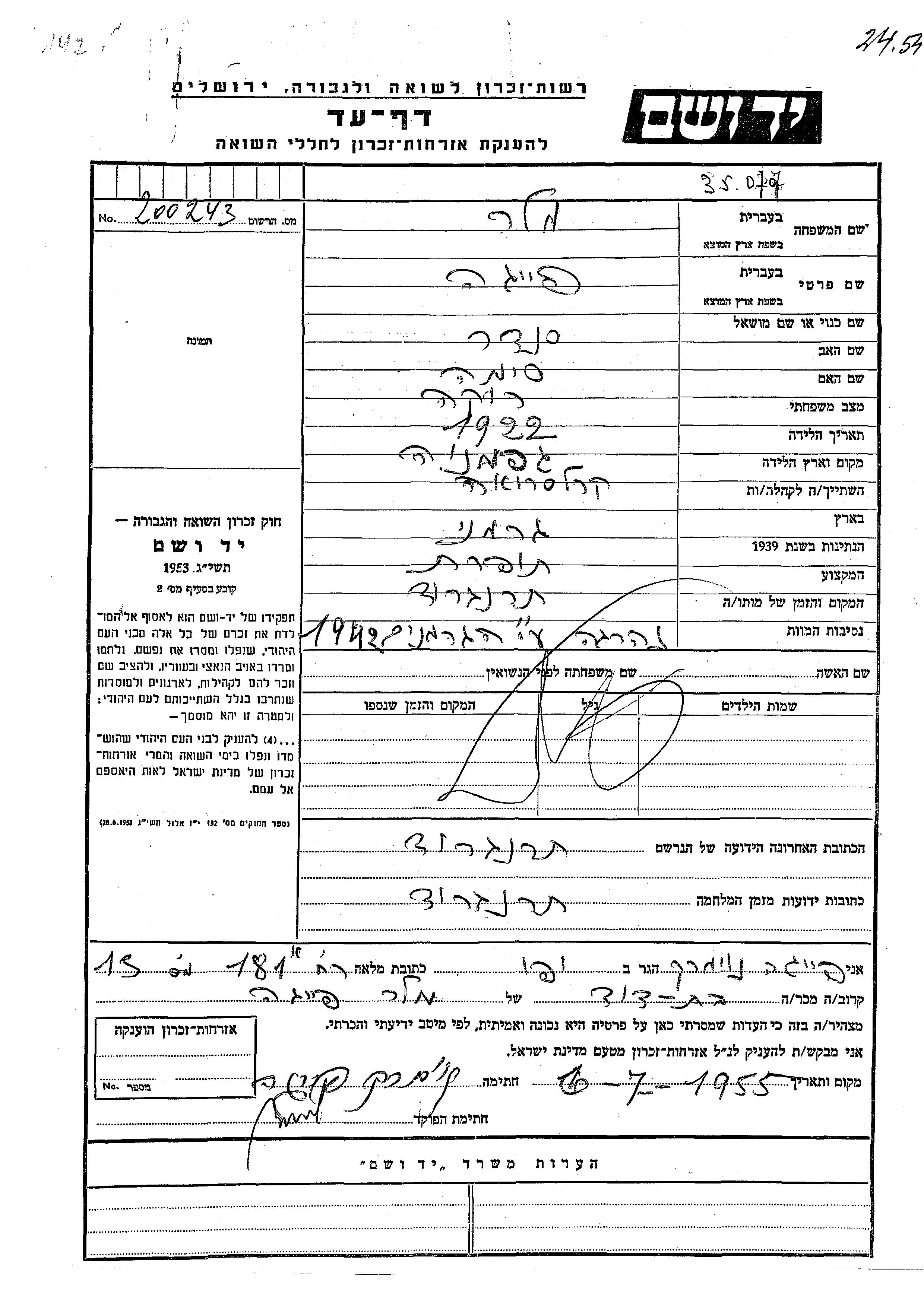 Yad Vashem - Pages of Testimony Names Memorial Collection