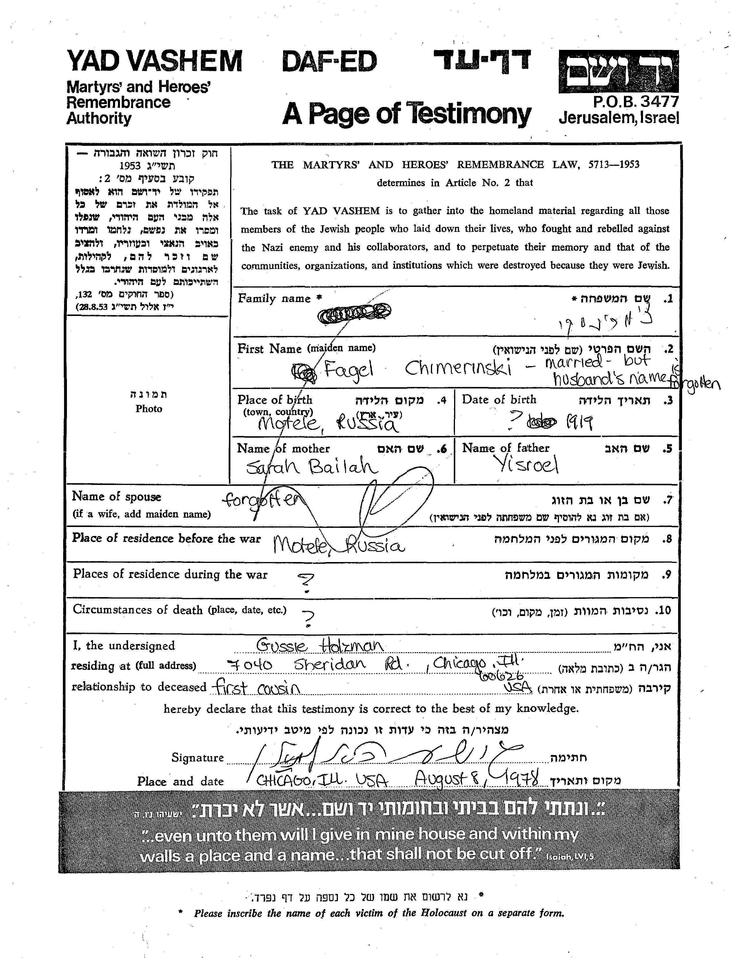 Chimerinski Fagel 1919 Motele, Poland Page of Testimony