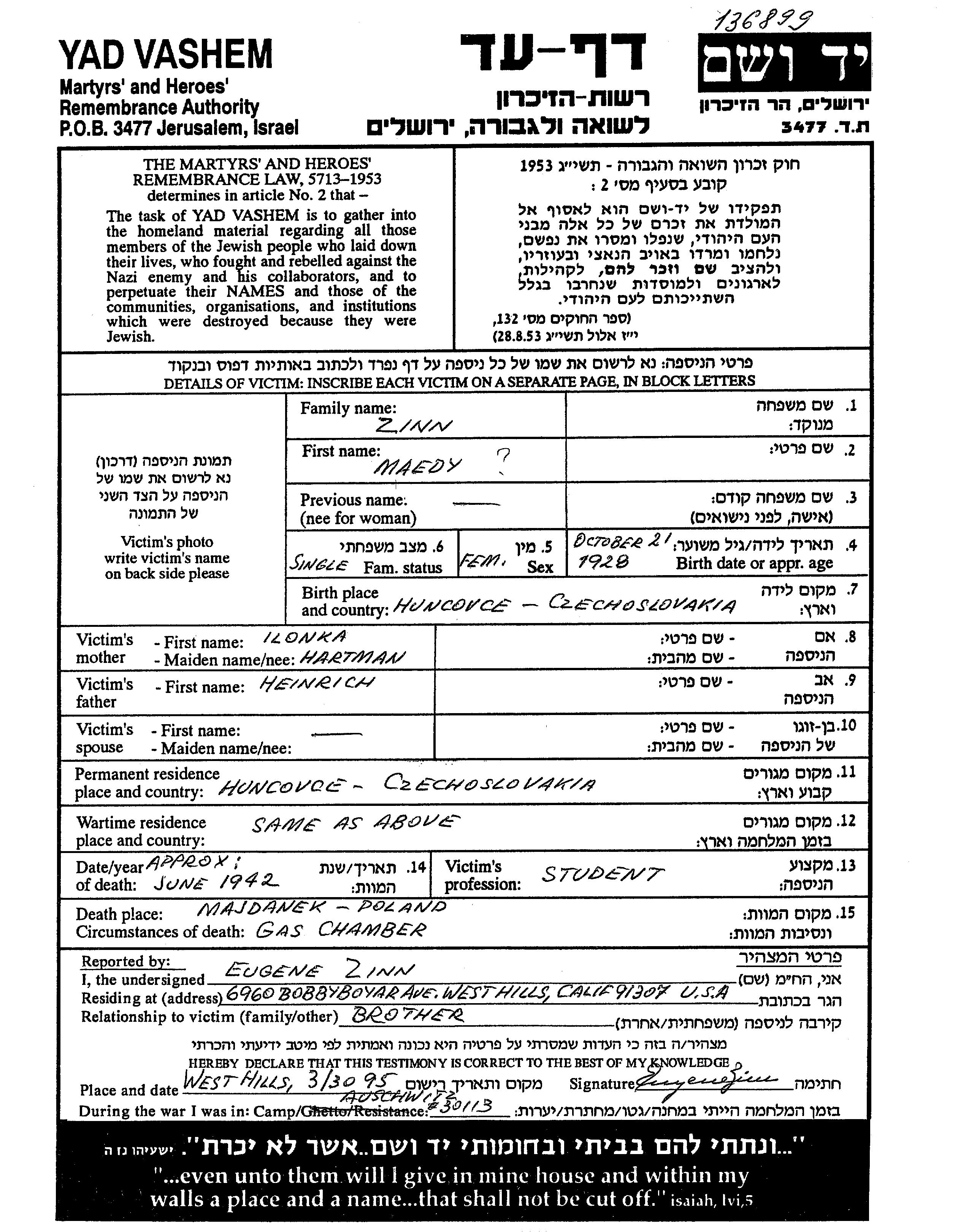 Maedy Miriam Zinn Zin was born in Huncovce, Czechoslovakia, 1928. She was a pupil. Prior to WWII she lived in Huncovce, Czechoslovakia.