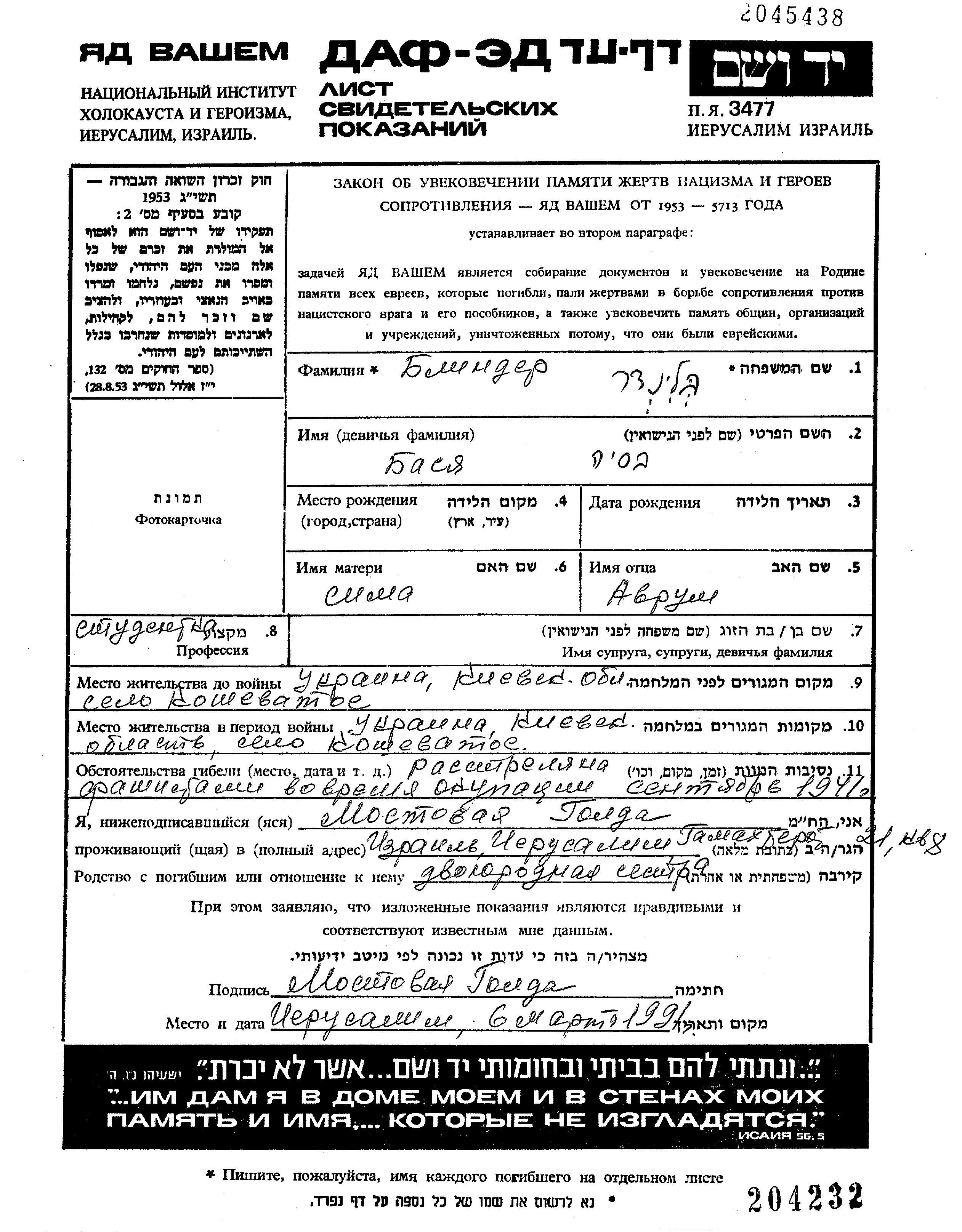 Blinder Basia Koshevatoye, Ukraine (USSR) Page of Testimony