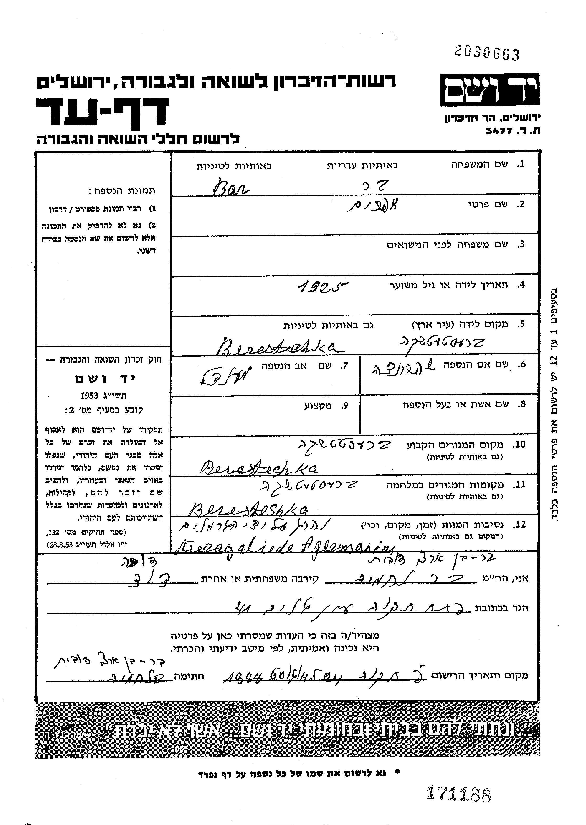 Bar Ber | Efraim | 1925 | Beresteczko, Poland | Page of Testimony |