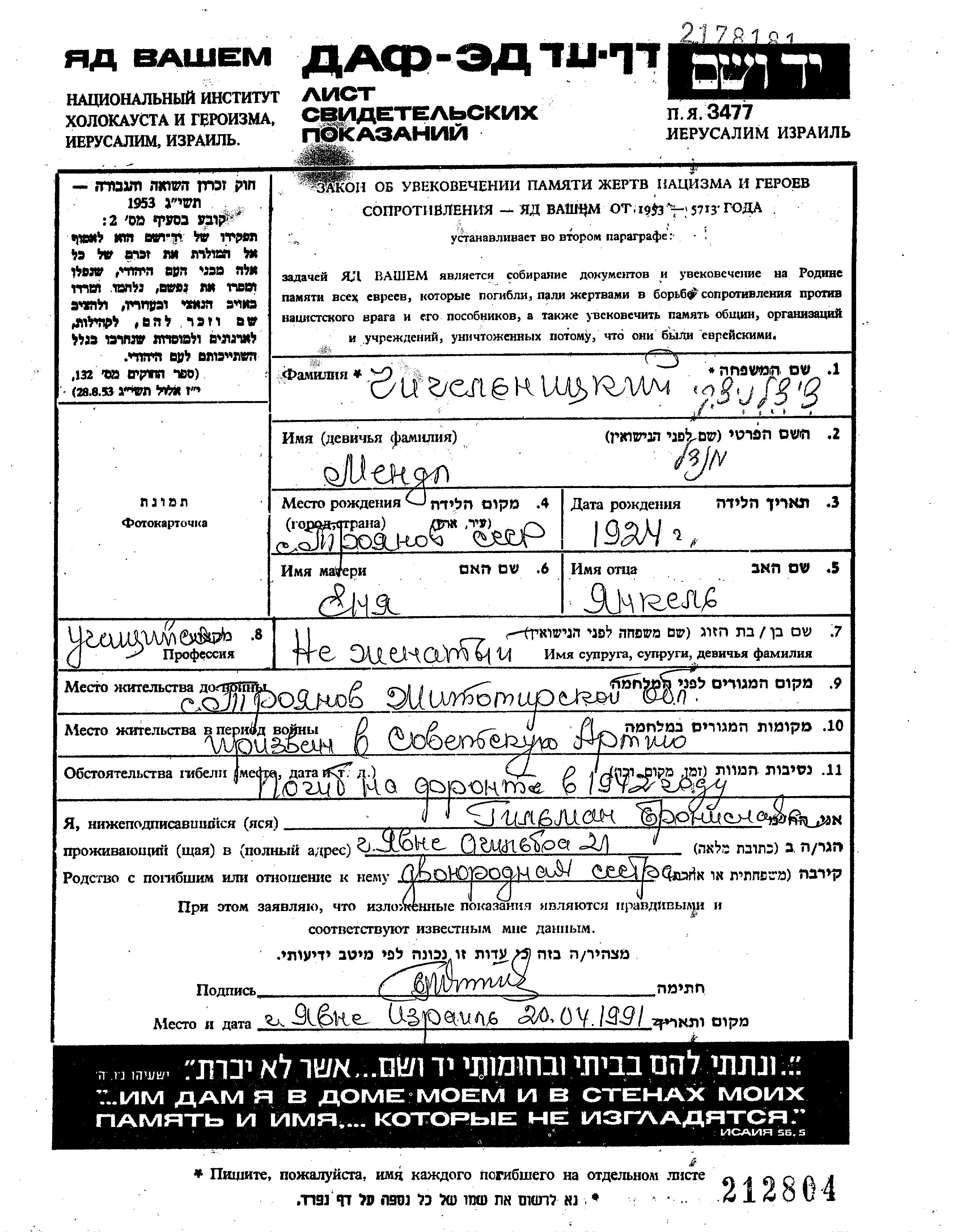 Mendel Chichelnitzki was born in Troyanov, Ukraine (USSR), 1924. He was a pupil. Prior to WWII he lived in Troyanov, Ukraine (USSR). Mendel was killed in military service in WWII. Place of death: unstated place, 1942.