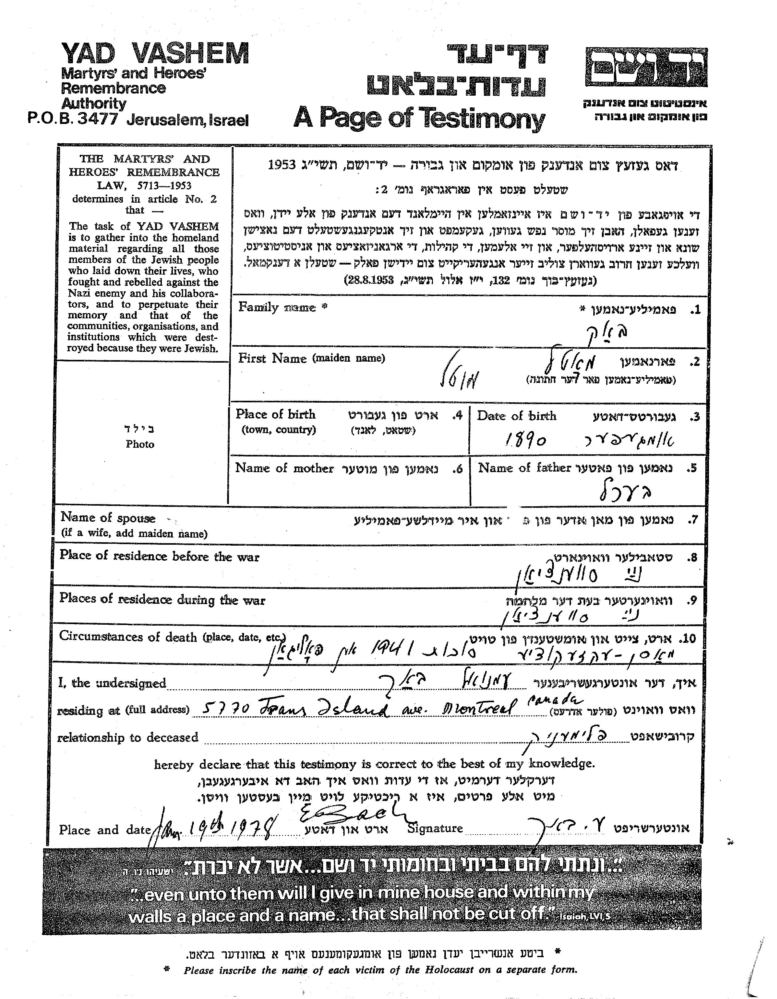 Yad Vashem - Pages of Testimony Names Memorial Collection