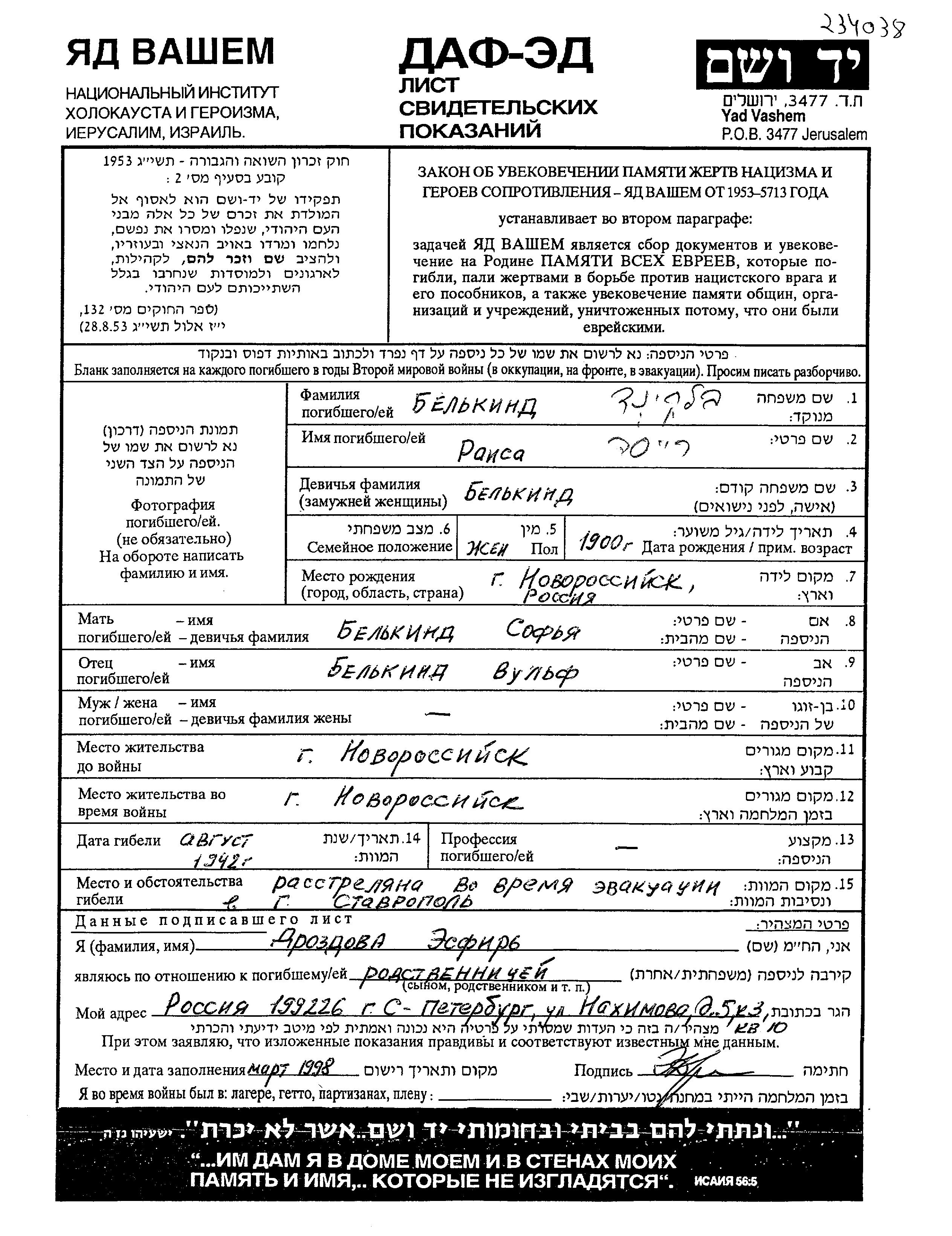 Raisa Belkind was born in Novorossiysk, Russia (USSR), 1900. She was a secretary. Prior to WWII she lived in Novorossiysk, Russia (USSR). Raisa was murdered in the Shoah. Place of death: Voroshilovsk, Russia (USSR), 1942.