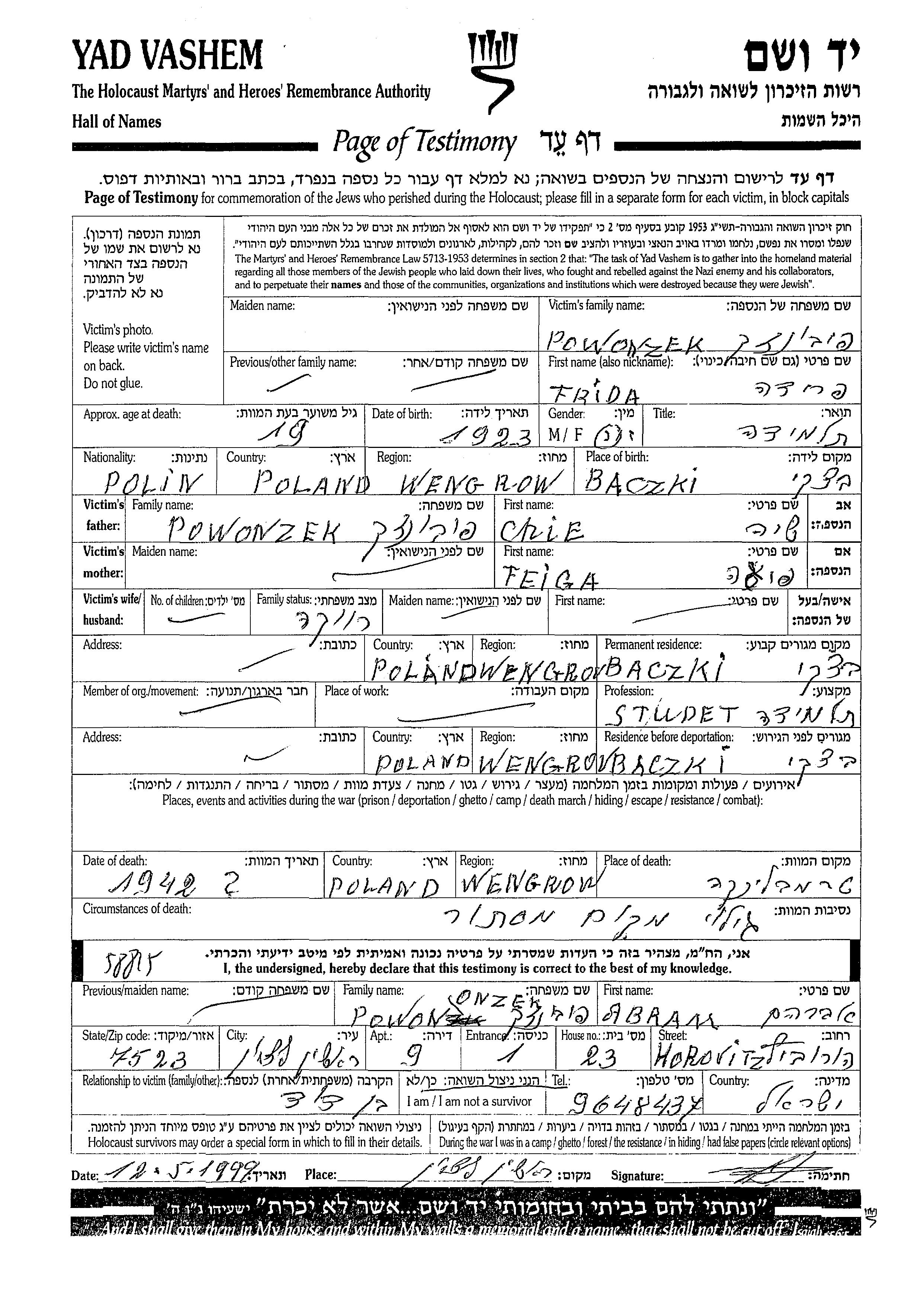 Frida Freida Powonzek was born in Baczki, Poland, 1923. She was a pupil. Prior to WWII she lived in Baczki, Poland.