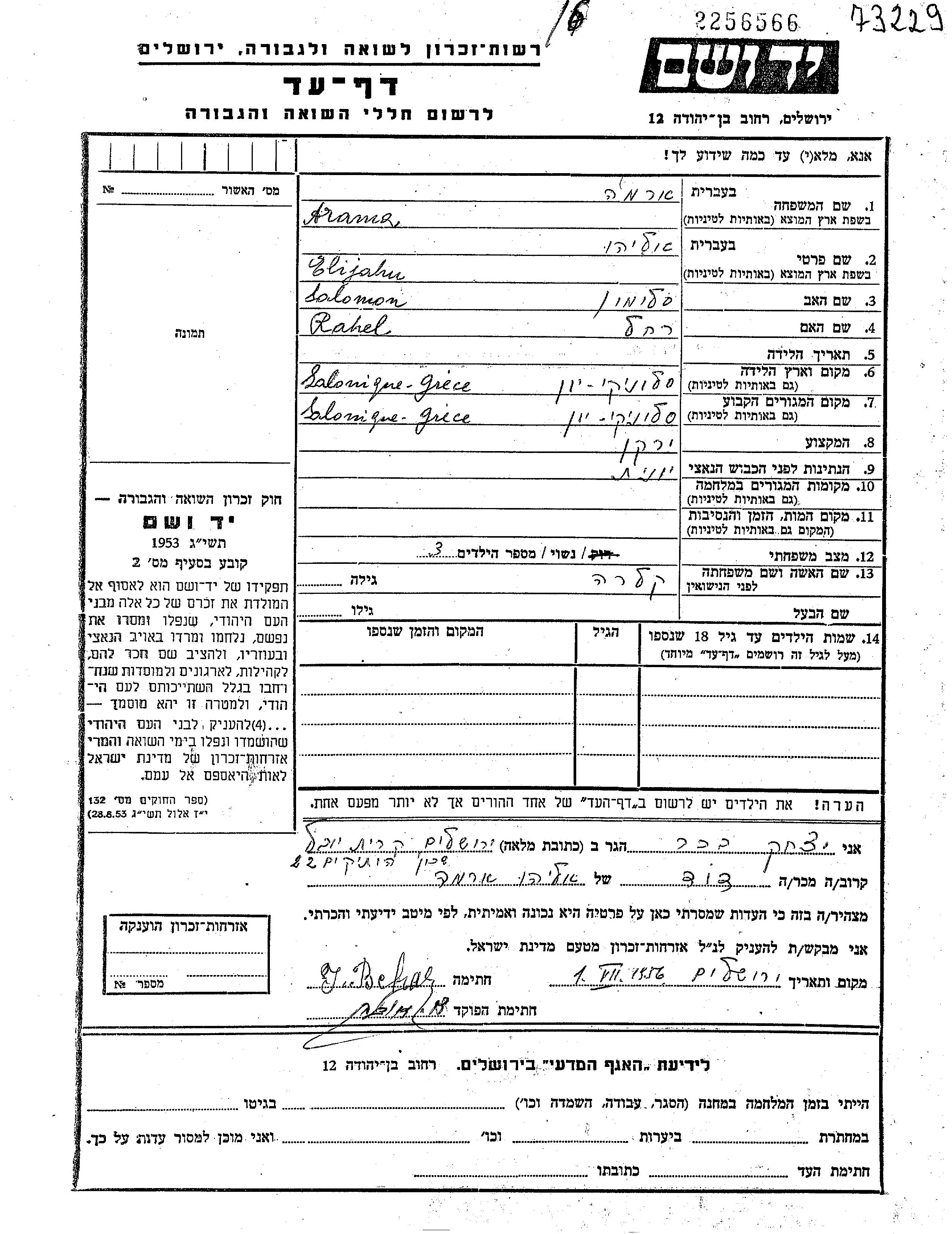 Arama Elijahu Saloniki, Greece Page of Testimony