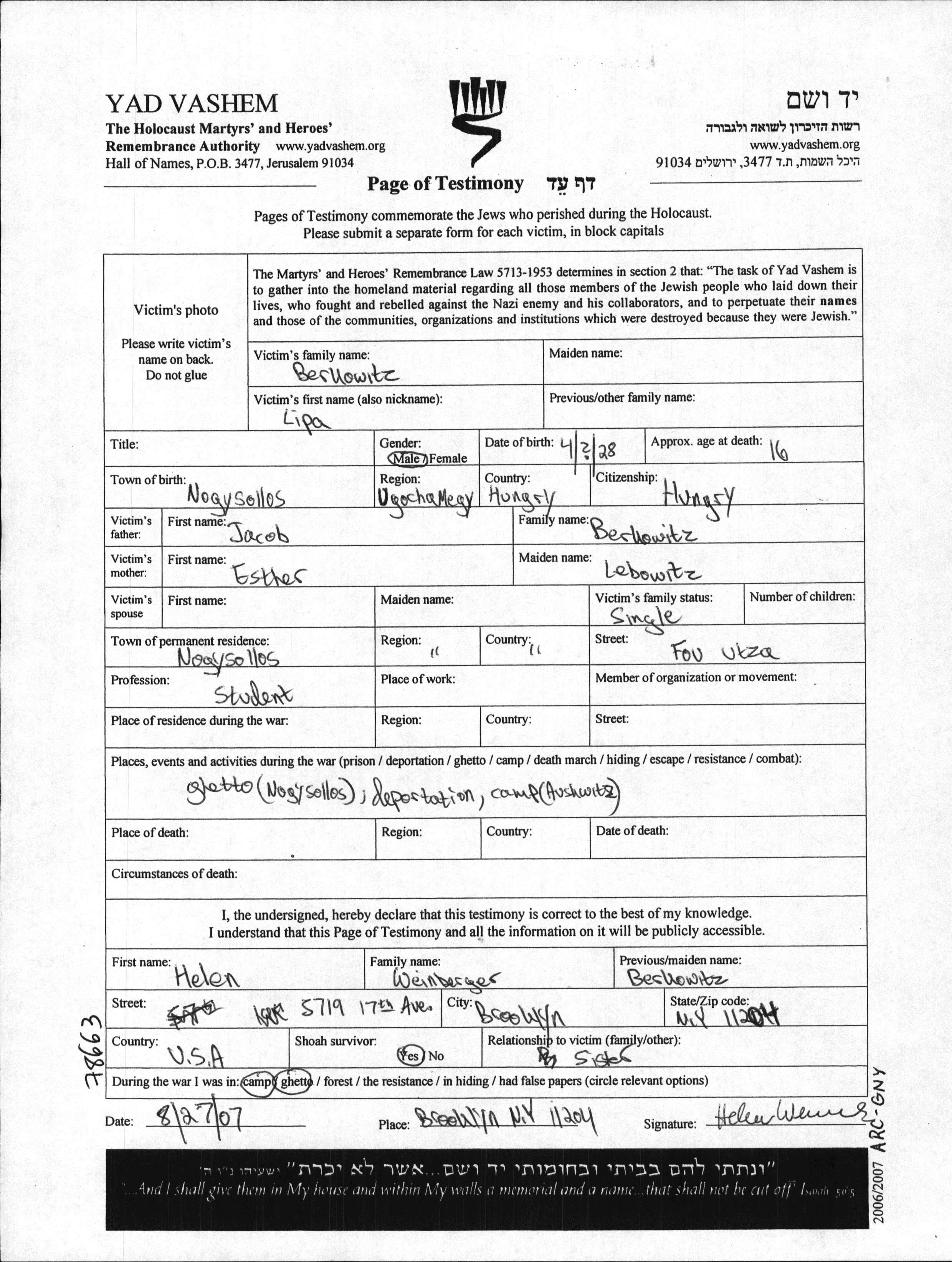 | Berkowitz | Lipa | 1928 | Nogysollos, Czechoslovakia | Page of Testimony |