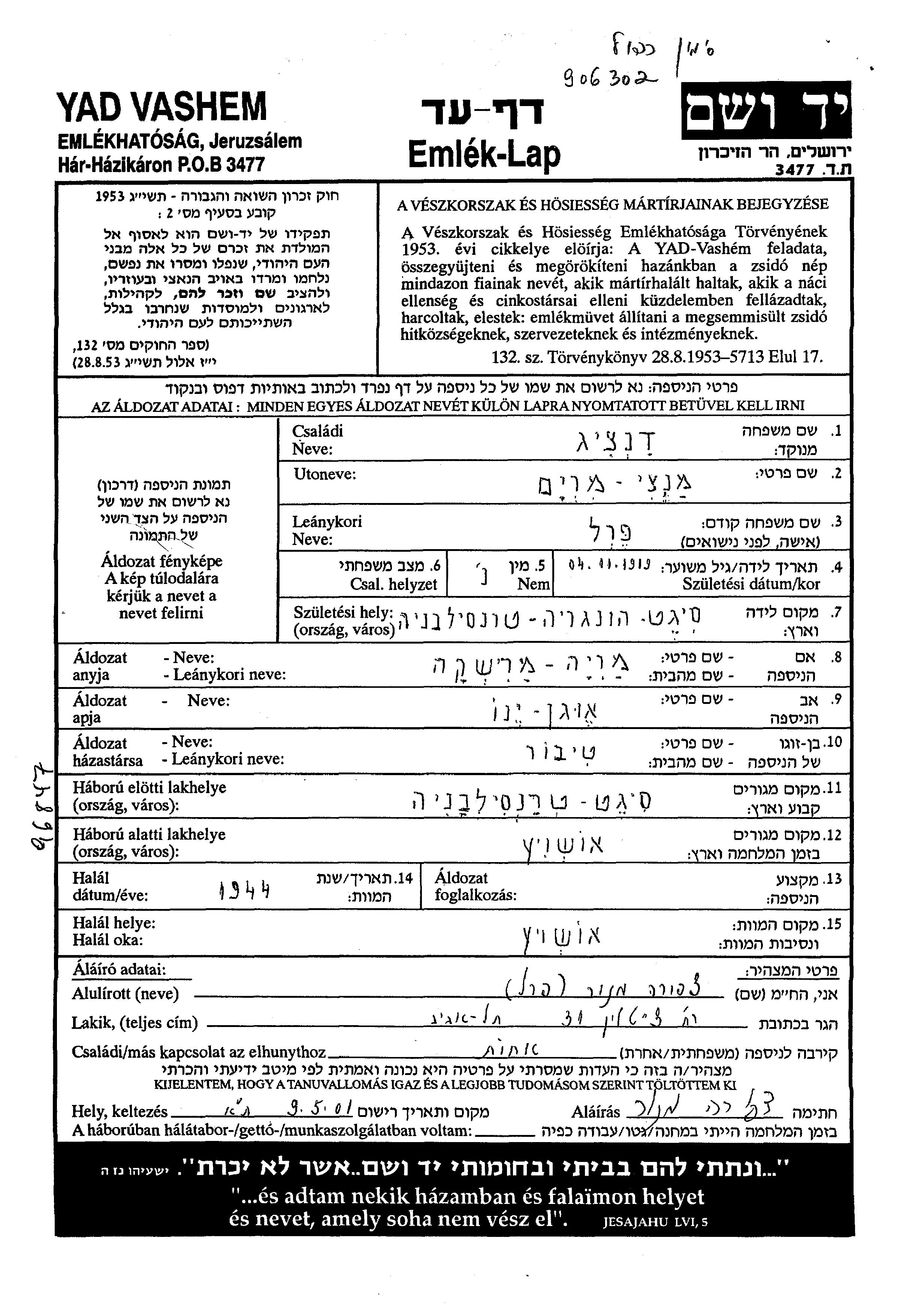 | Dantzig | Mantzi Miriam | 1919 | Sighet, Romania | Page of Testimony |