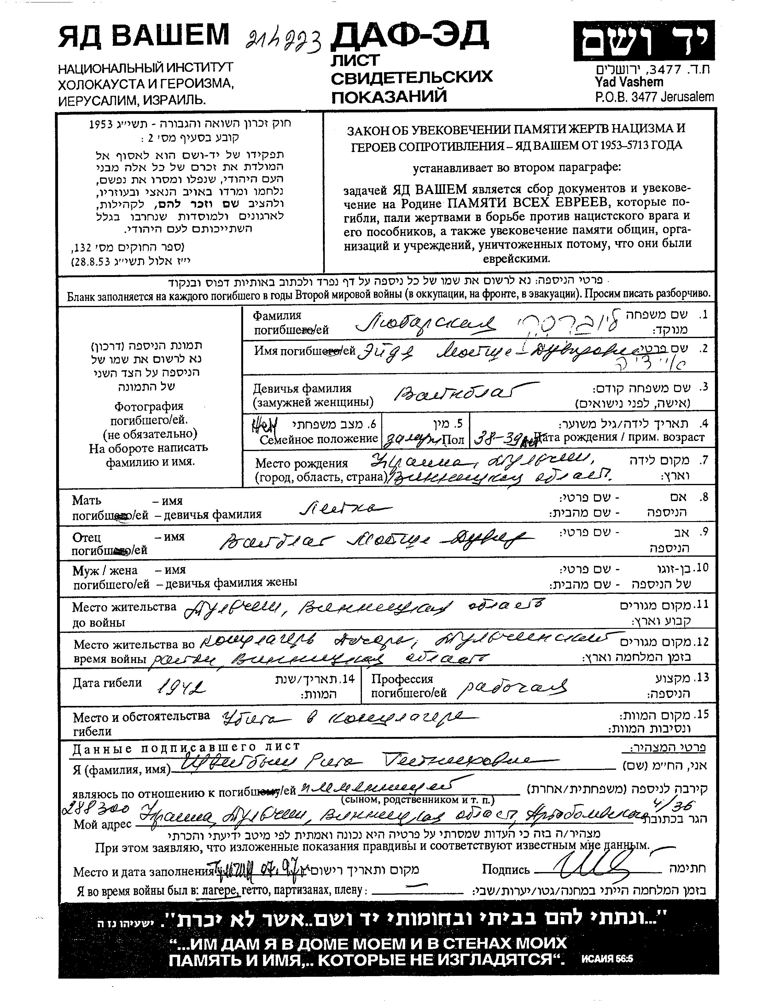 Lyubarski Eidya 1904 Tulchin, Ukraine (USSR) Page of Testimony
