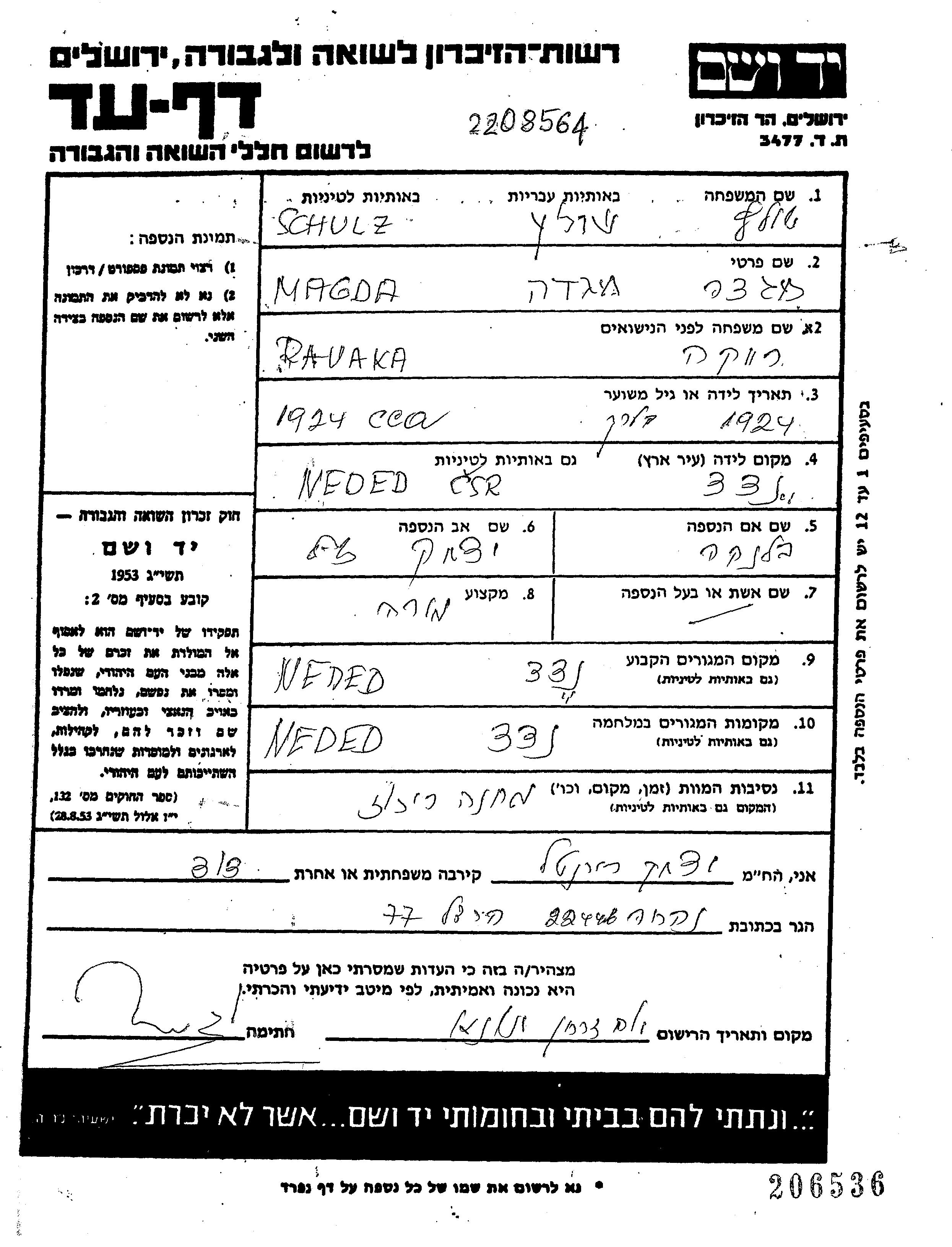 Magda Schultz was born in Neded, Czechoslovakia. Prior to WWII she lived in Neded, Czechoslovakia.