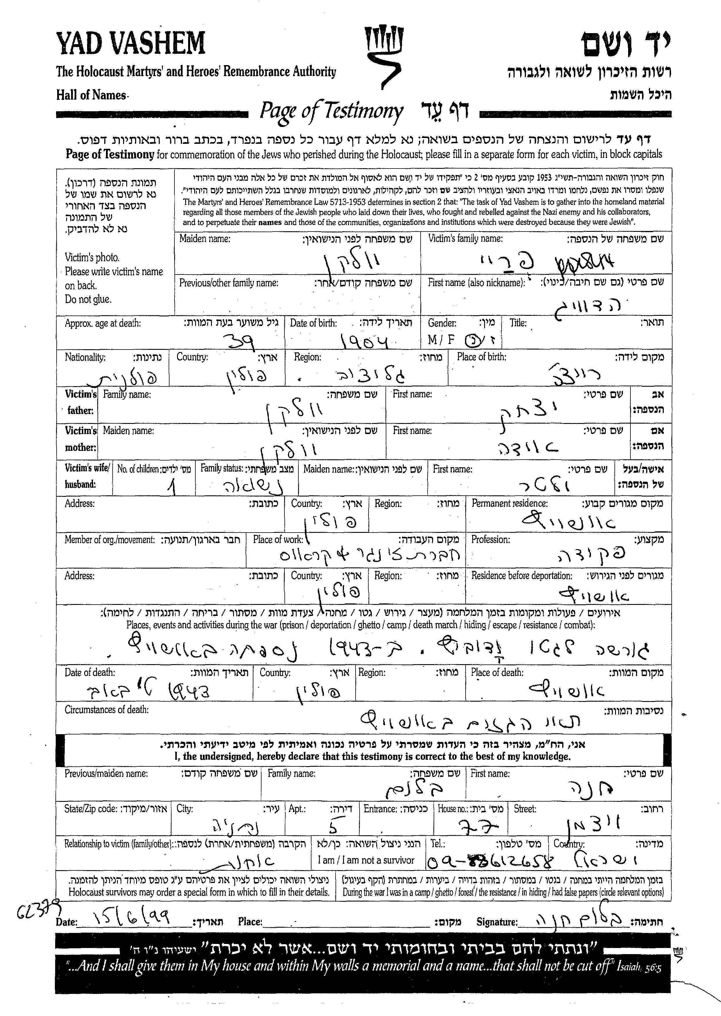 Yad Vashem - Pages of Testimony Names Memorial Collection