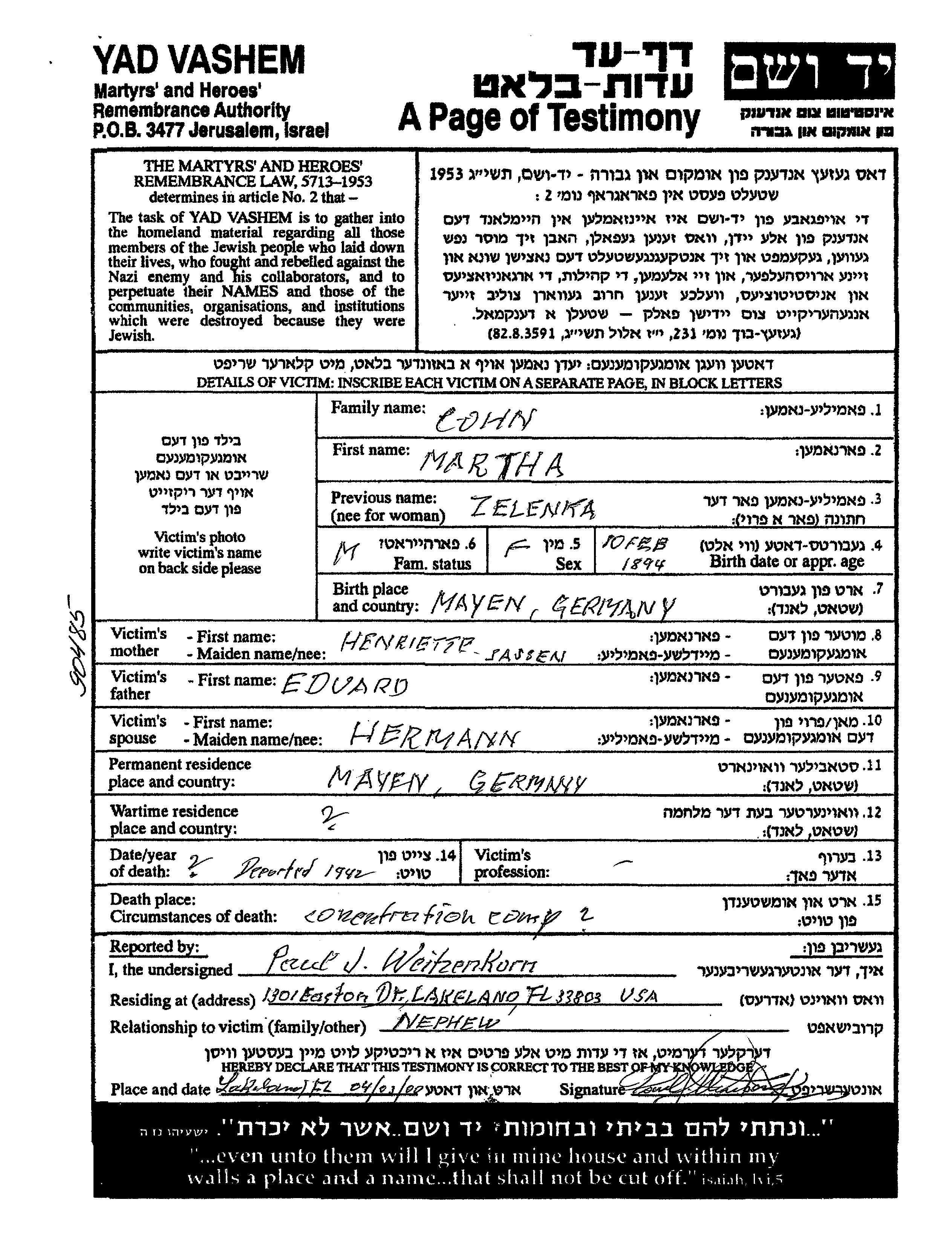 Yad Vashem - Pages of Testimony Names Memorial Collection