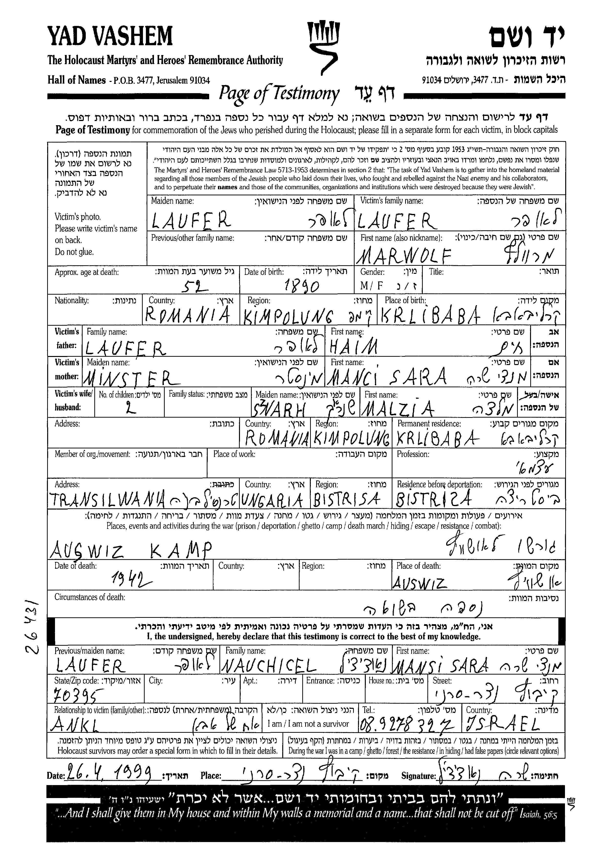 Laufer Mar Wolf 1890 Carlibaba, Romania Page of Testimony