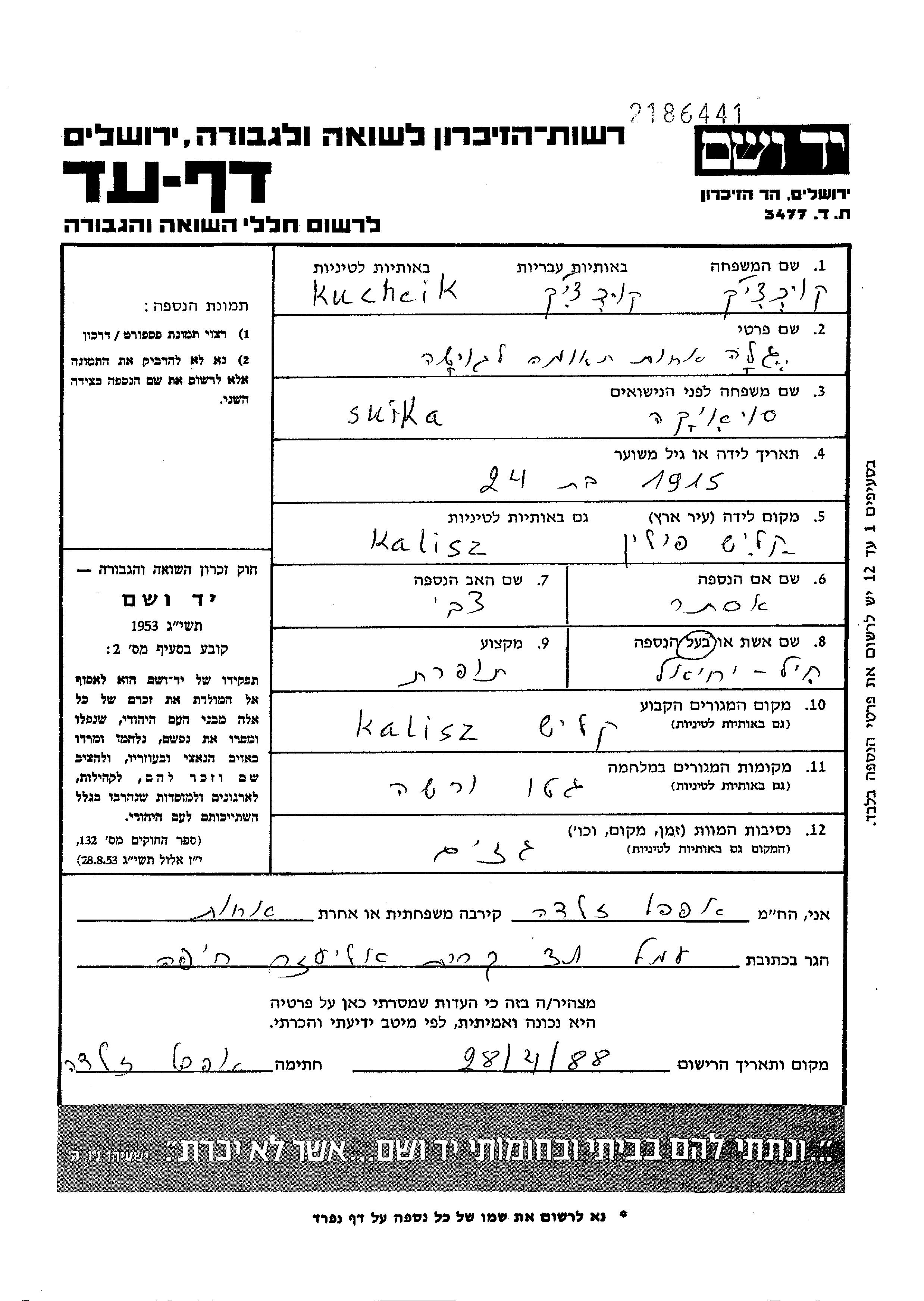 Gela Gila Sujka nee Kuchcik Kurchik was born in Kalisz, Poland. Prior to WWII she lived in Kalisz, Poland. Gela Gila was murdered in the Shoah. Place of death: Warszawa, Poland, 1942.