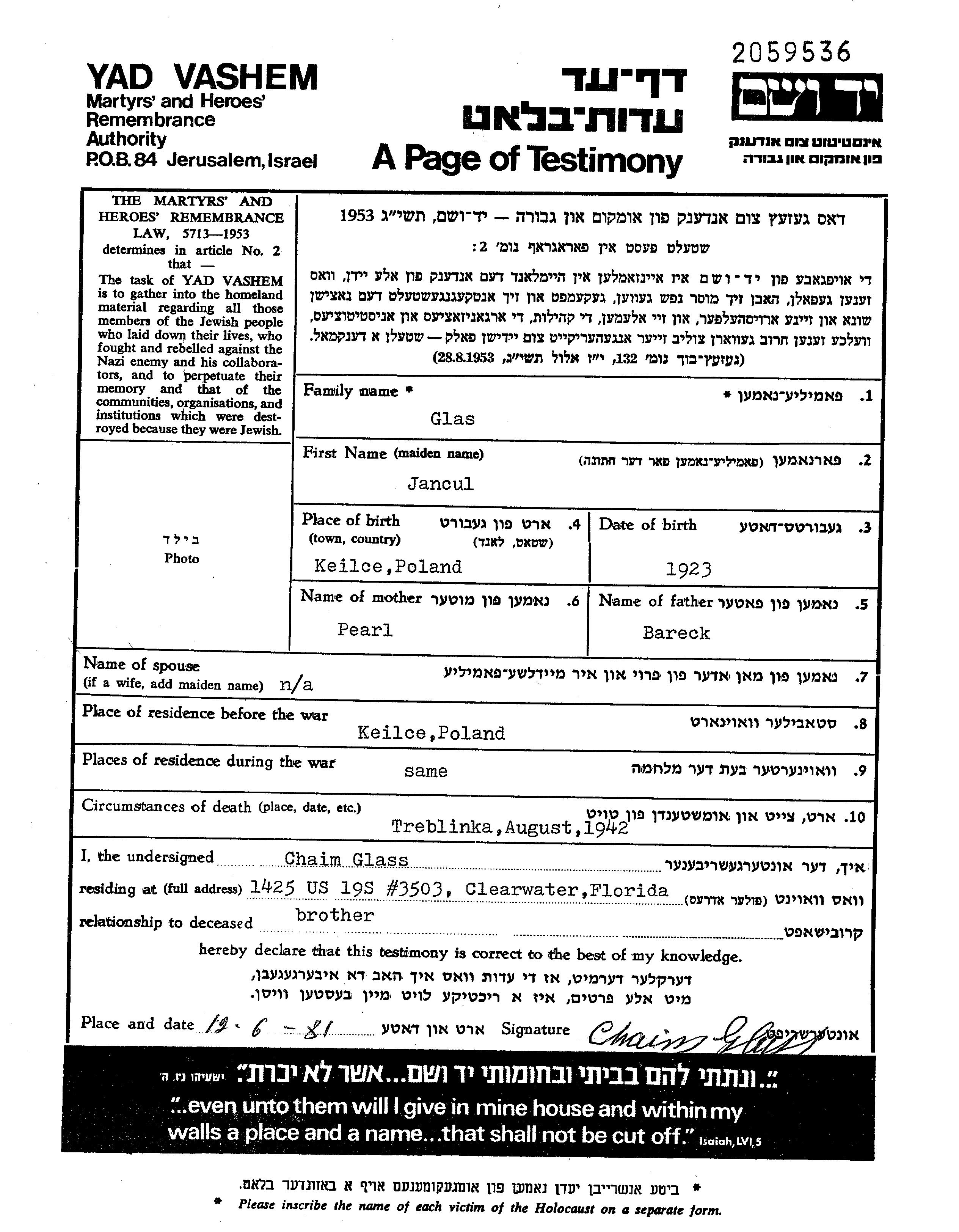 Glas Jancul 1923 Kielce, Poland Page of Testimony