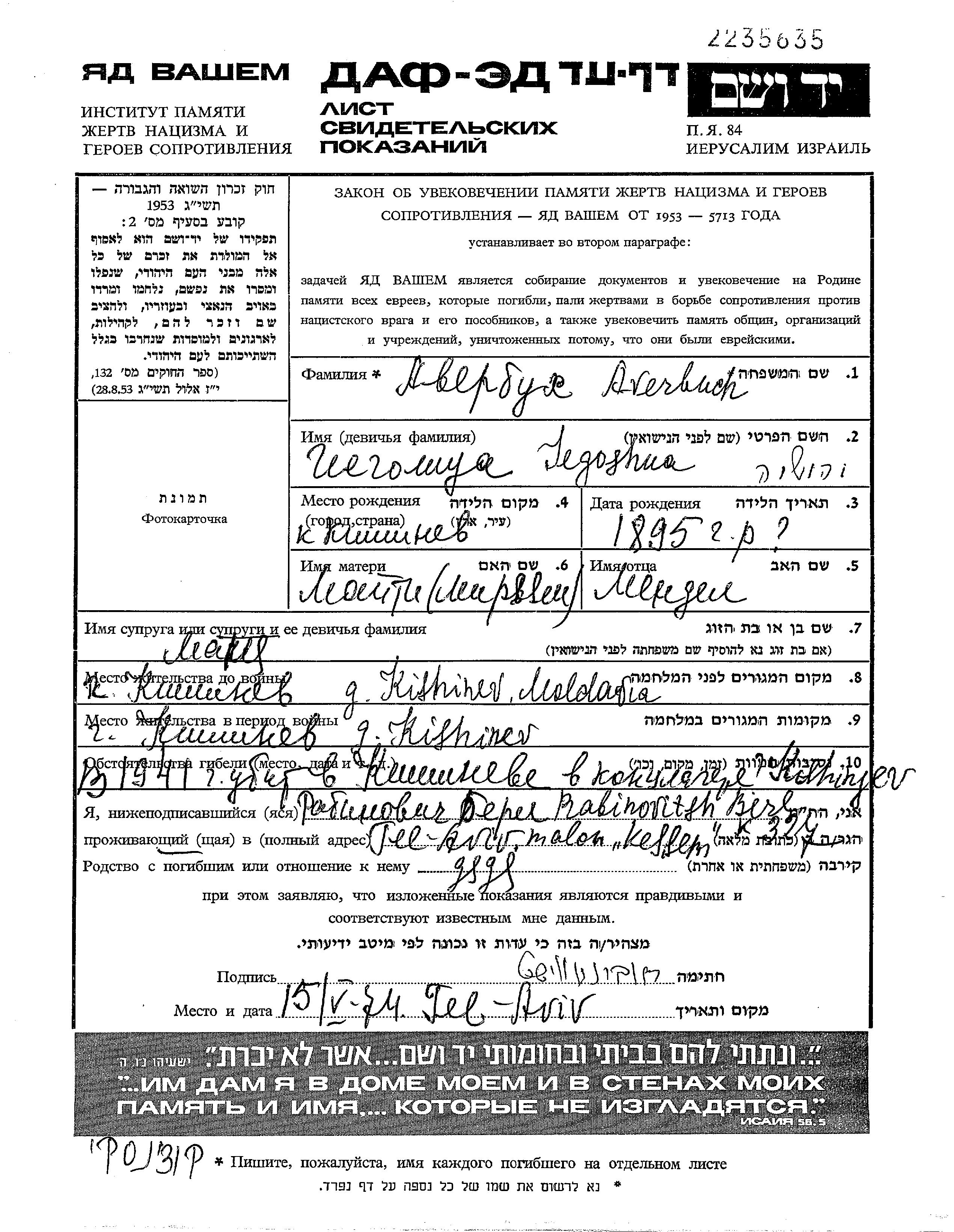 Awerbuch Yehoshua 1895 Kishinev, Romania Page of Testimony