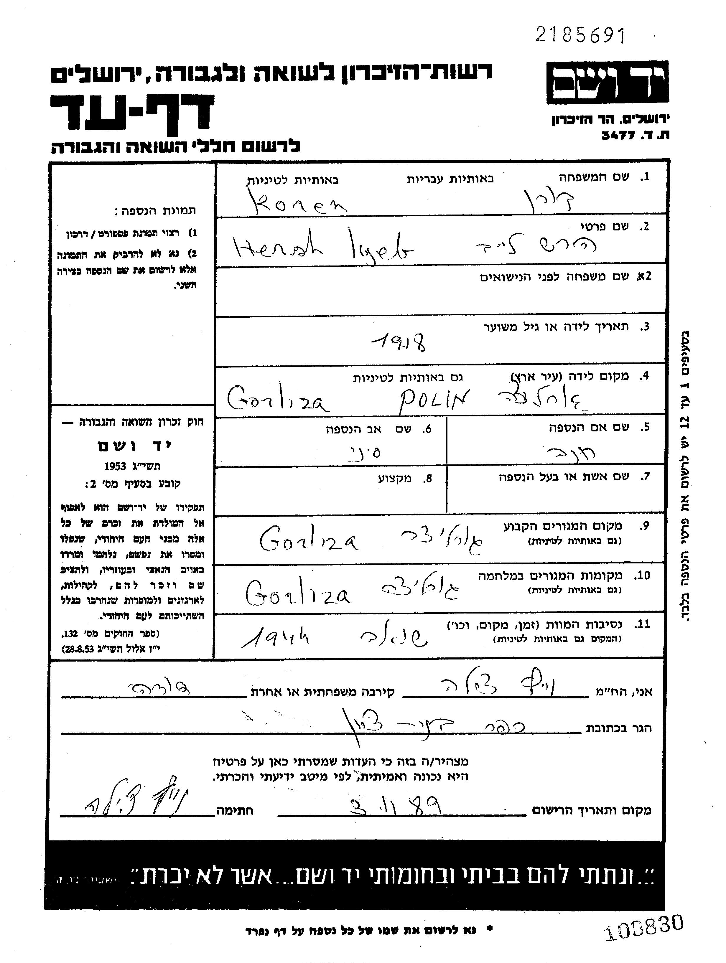 Koren Korn Hersh Lyeb 1918 Gorlice, Poland Page of Testimony