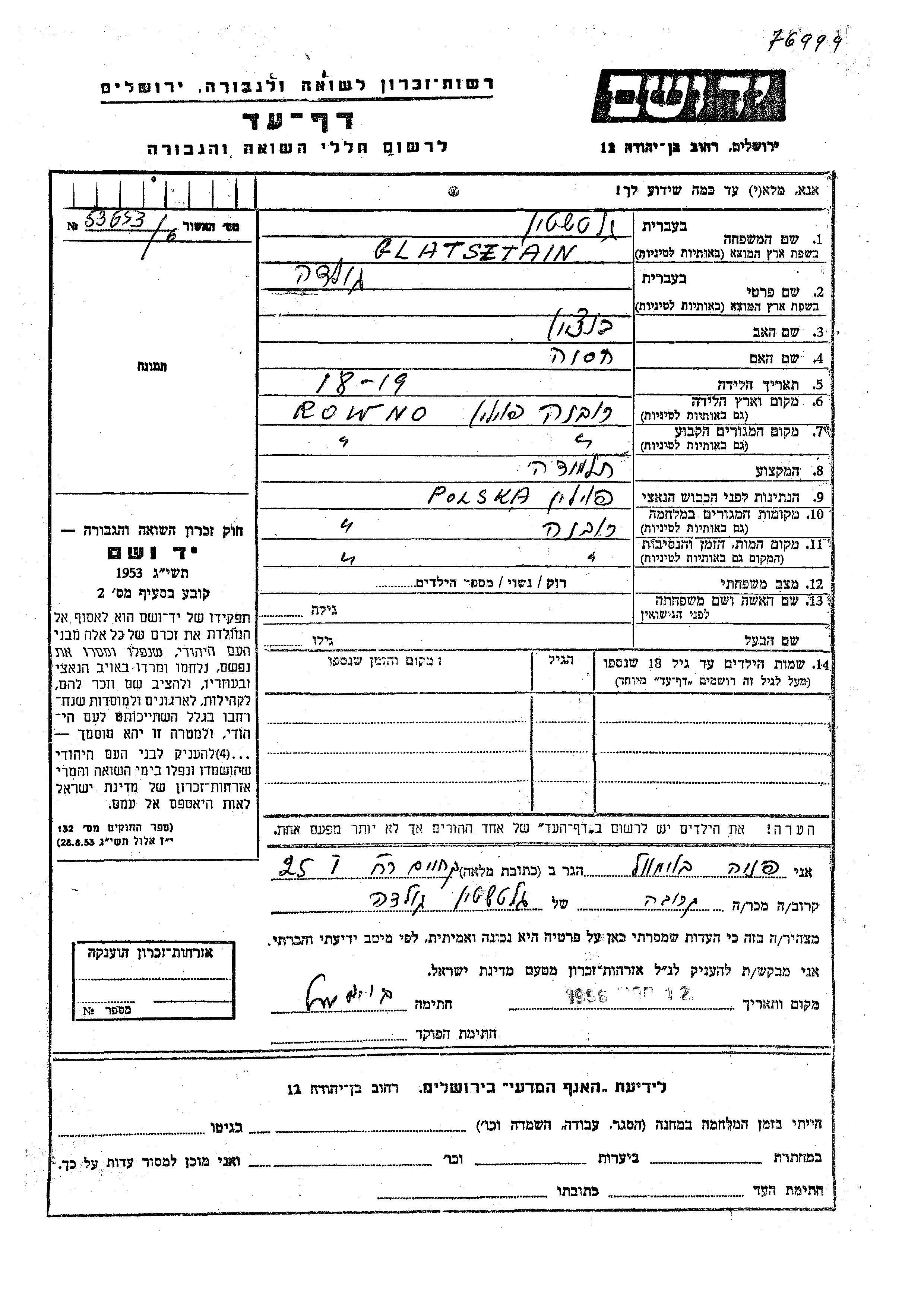 Glatsztajn Golda 1925 Rowno, Poland Page of Testimony