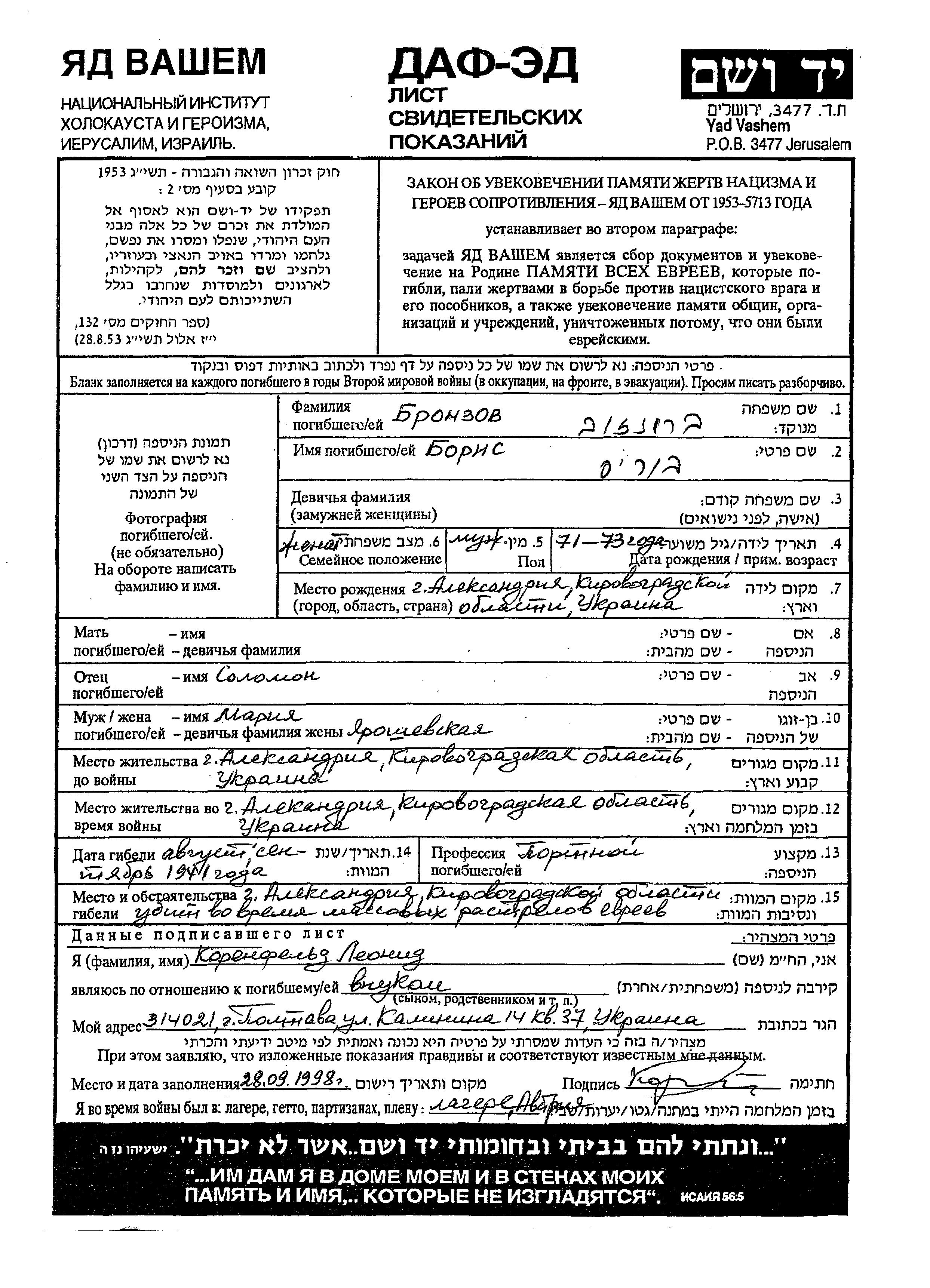 Boris Bronzov was born in Aleksandriya, Ukraine (USSR). He was a tailor. Prior to WWII he lived in Aleksandriya, Ukraine (USSR). Boris was murdered in the Shoah. Place of death: unknown, 1941.