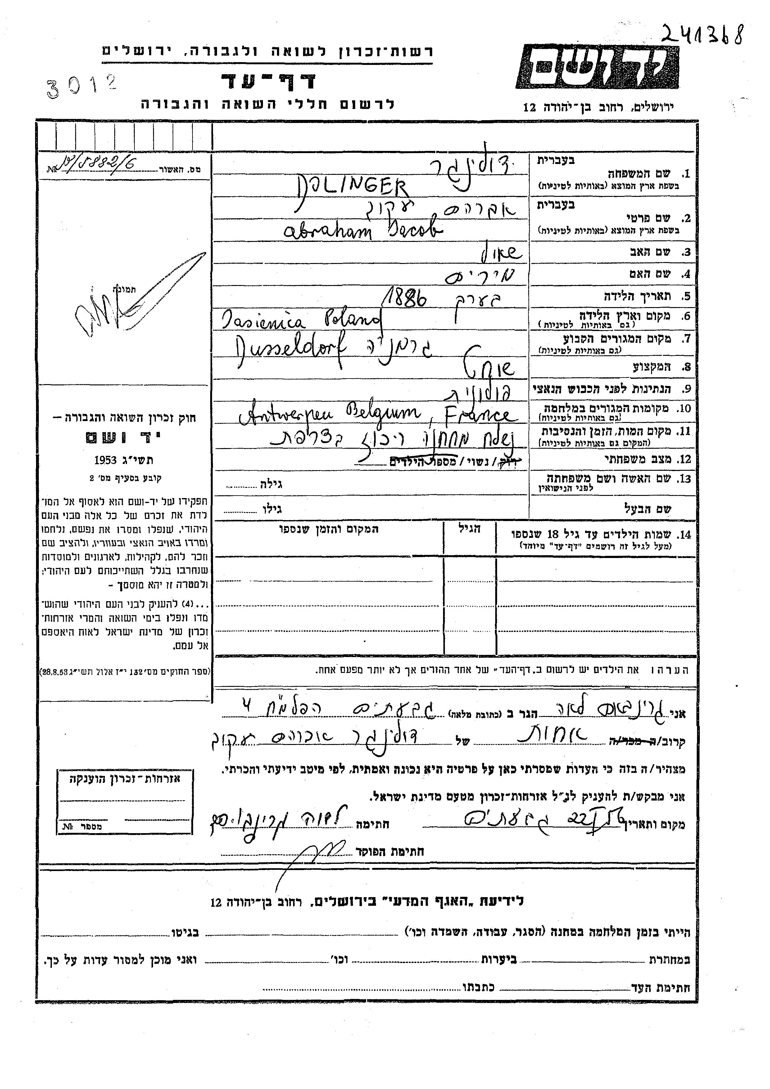 Avraham Yaakov Dolinger was born in Jasienica, Poland, 1883. He was a ritual slaughterer. Prior to WWII he lived in Antwerpen, Belgium.