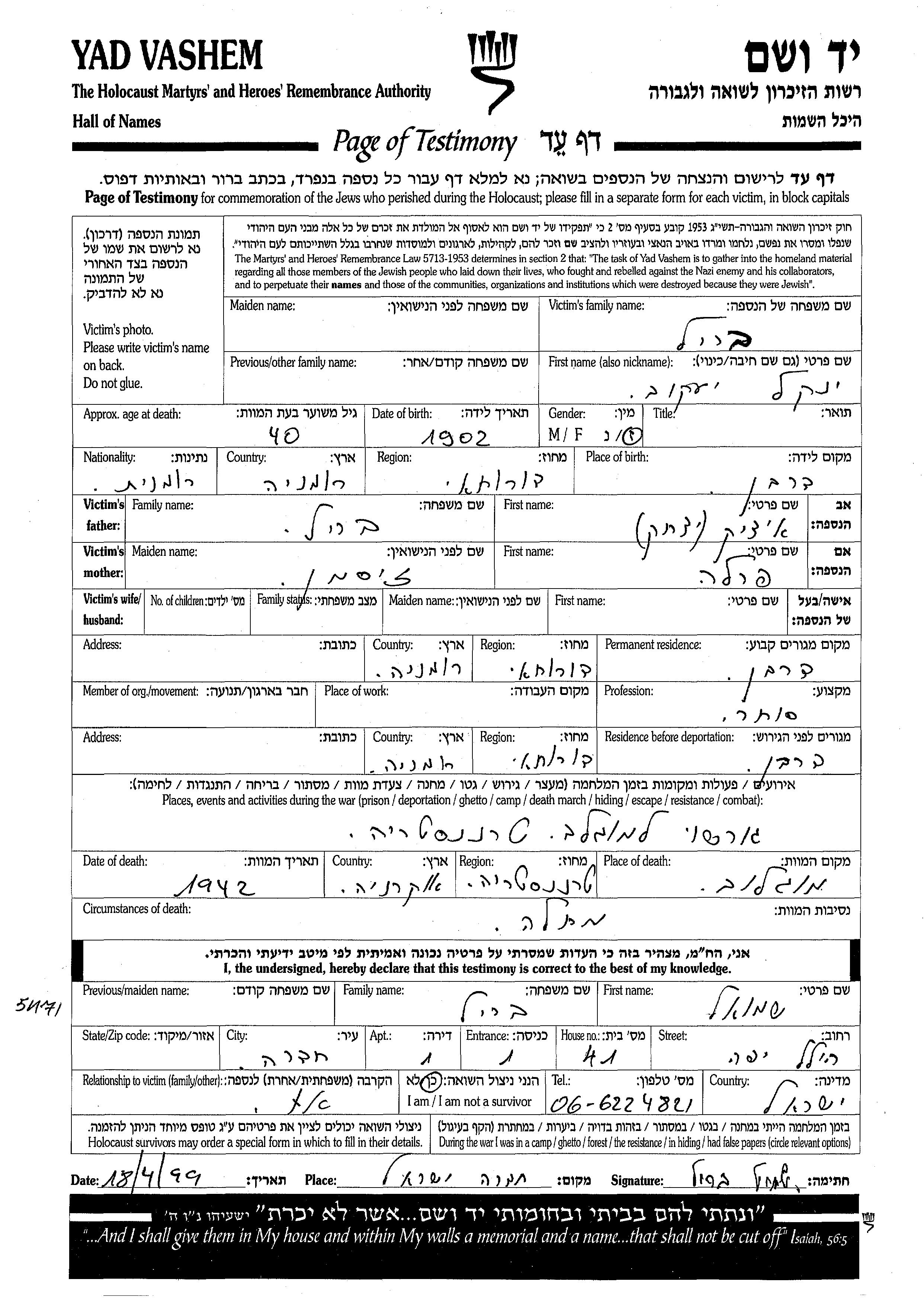 Iancu Yaakov Brill was born in Darabani, Romania. He was a merchant. Prior to WWII he lived in Darabani, Romania. Iancu Yaakov was murdered in the Shoah. Place of death: unknown, 1942.